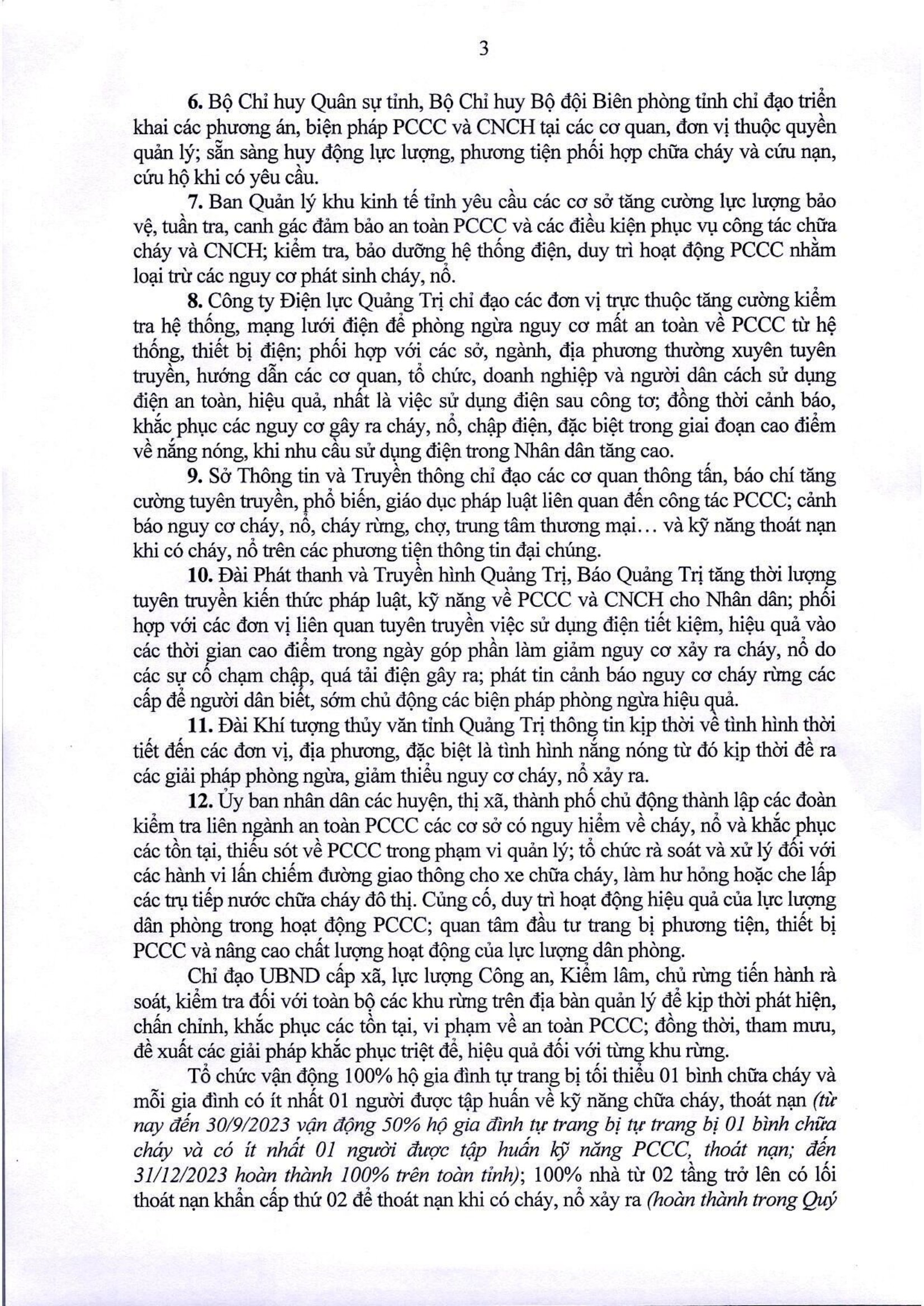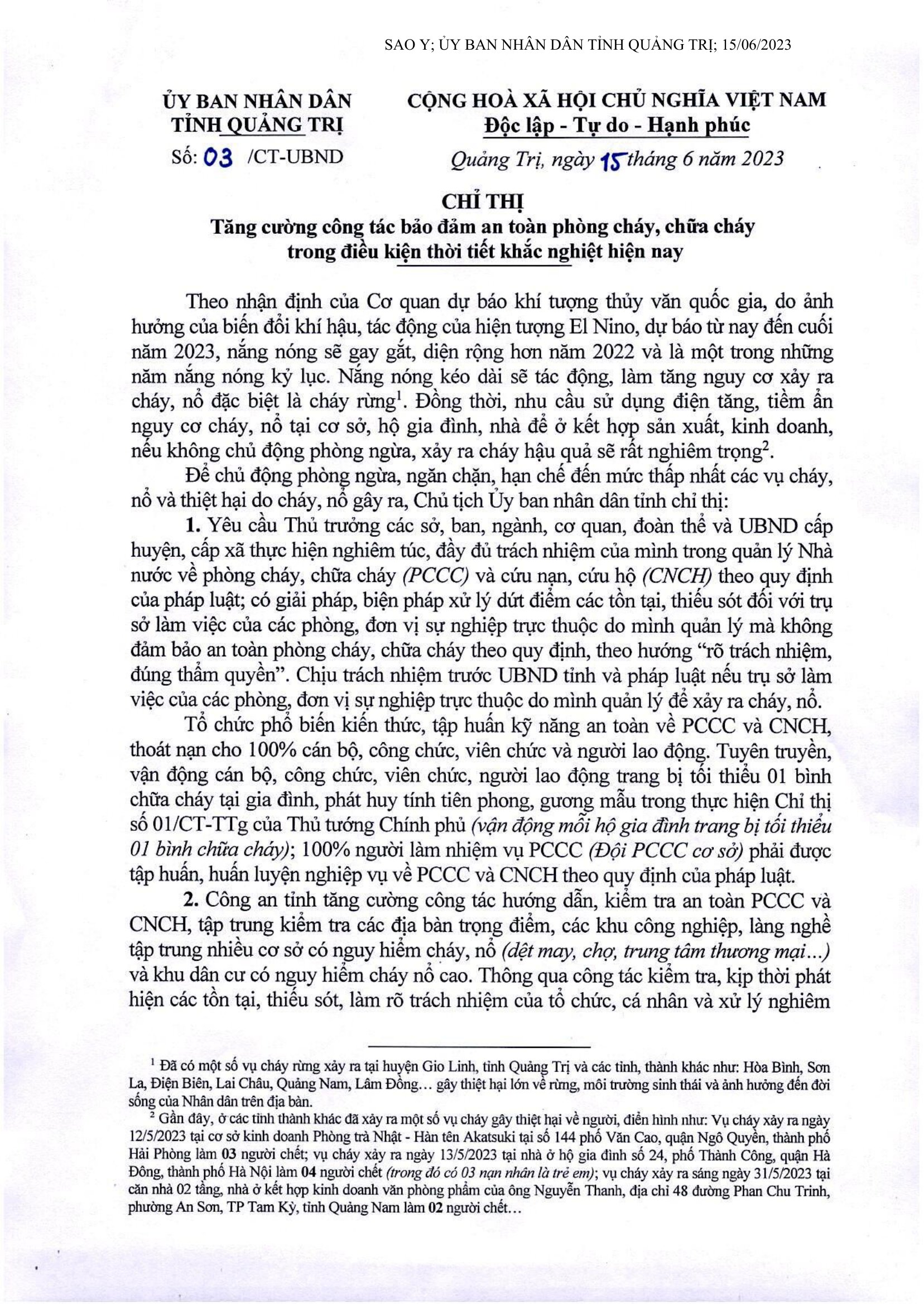 Ngày 15/6/2023, UBND tỉnh Quảng Trị ban hành Chỉ thị về tăng cường công tác bảo đảm phòng cháy, chữa cháy trong điều kiện thời tiết khắc nghiệt hiện nay.