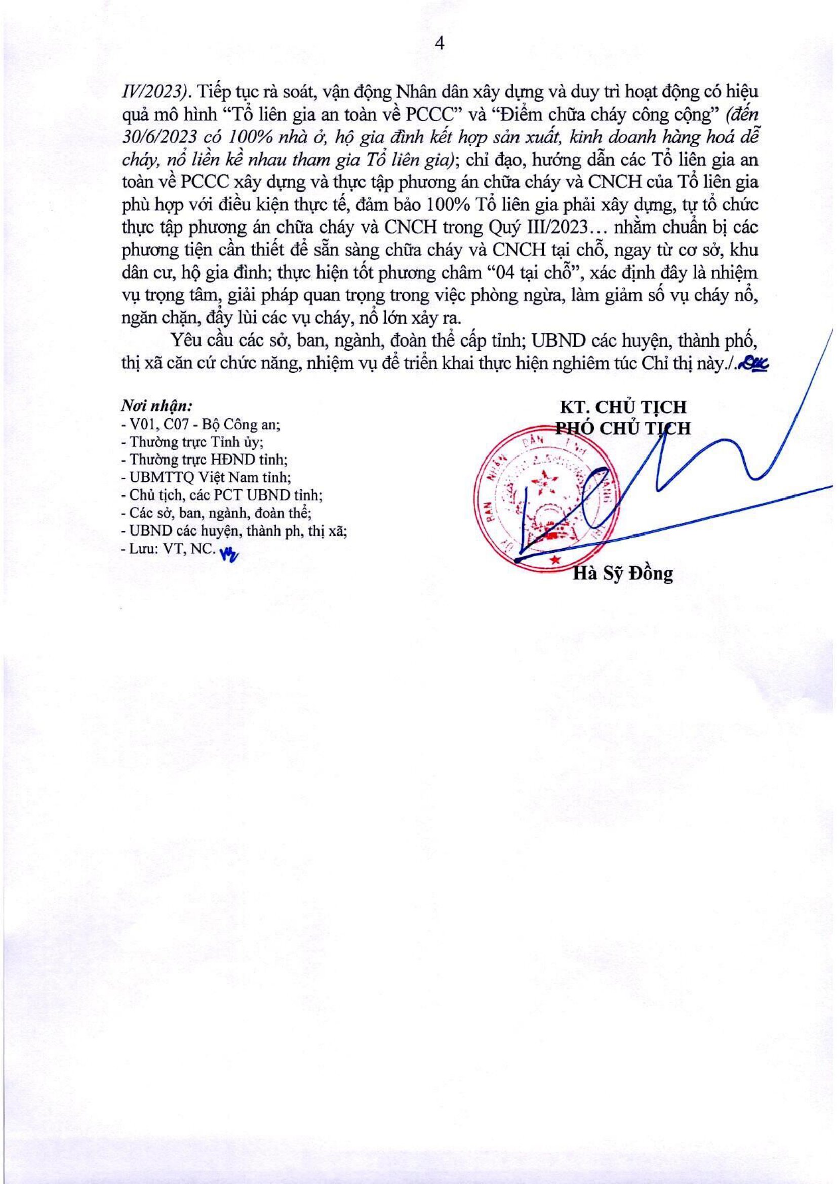 Các địa phương tổ chức vận động 100% hộ gia đình tự trang bị tối thiểu 1 bình chữa cháy và mỗi gia đình có ít nhất 1 người được tập huấn kỹ năng chữa cháy, thoát nạn; 100% nhà từ 2 tầng trở lên có lối thoát nạn khẩn cấp. Tiếp tục rà soát, vận động Nhân dân xây dựng và duy trì hoạt động có hiệu quả mô hình “Tổ liên gia về PCCC” và “Điểm chữa cháy công cộng”…