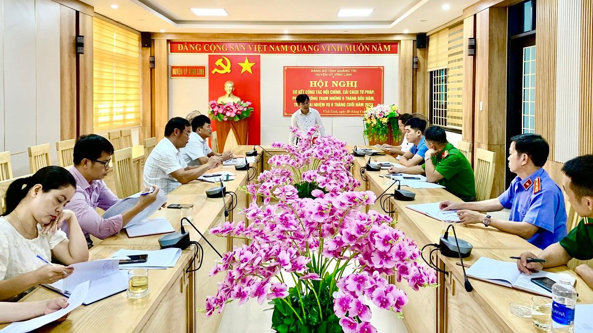 Trong 6 tháng đầu năm 2023, Huyện ủy Vĩnh Linh đã tập trung chỉ đạo, bám sát các nhiệm vụ chính trị của địa phương, các cơ quan trong khối nội chính đều thực hiện tốt nhiệm vụ được giao và đạt được nhiều kết quả quan trọng. Công tác quán triệt, triển khai tuyên truyền và phổ biến các văn bản chỉ đạo của Trung ương về công tác nội chính, cải cách tư pháp, phòng chống tham nhũng được tăng cường; việc tiếp nhận, xử lý các tin báo tố giác tội phạm và công tác khởi tố, điều tra, truy xét, thi hành án được thực hiện tốt; các giải pháp phòng ngừa tham nhũng được triển khai đồng bộ, hiệu quả; tình hình quốc phòng an ninh được giữ vững, trật tự an toàn xã hội cơ bản ổn định.