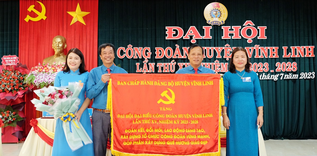 Lãnh đạo LĐLĐ tỉnh và huyện Vĩnh Linh chúc mừng Ban Chấp hành LĐLĐ huyện nhiệm kỳ 2023- 2028.