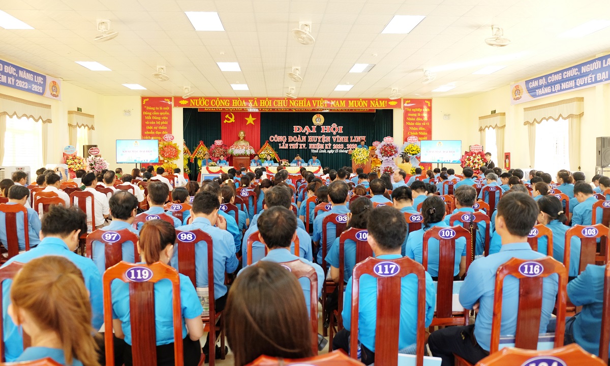 Ngày 13/7/2023, Liên đoàn lao động huyện Vĩnh Linh tổ chức Đại hội lần thứ XV, nhiệm kỳ 2023- 2028. Tham dự có các đồng chí: Nguyễn Thế Lập- Chủ tịch LĐLĐ tỉnh, Nguyễn Thị Hương- Phó Bí thư Thường trực Huyện ủy, Chủ tịch HĐND huyện, Nguyễn Anh Tuấn- Phó Chủ tịch UBND huyện, Vũ Văn Phong- Chủ tịch UBMTTQVN huyện, cùng 135 đại biểu đại diện cho hơn 3.200 đoàn viên công đoàn huyện.
