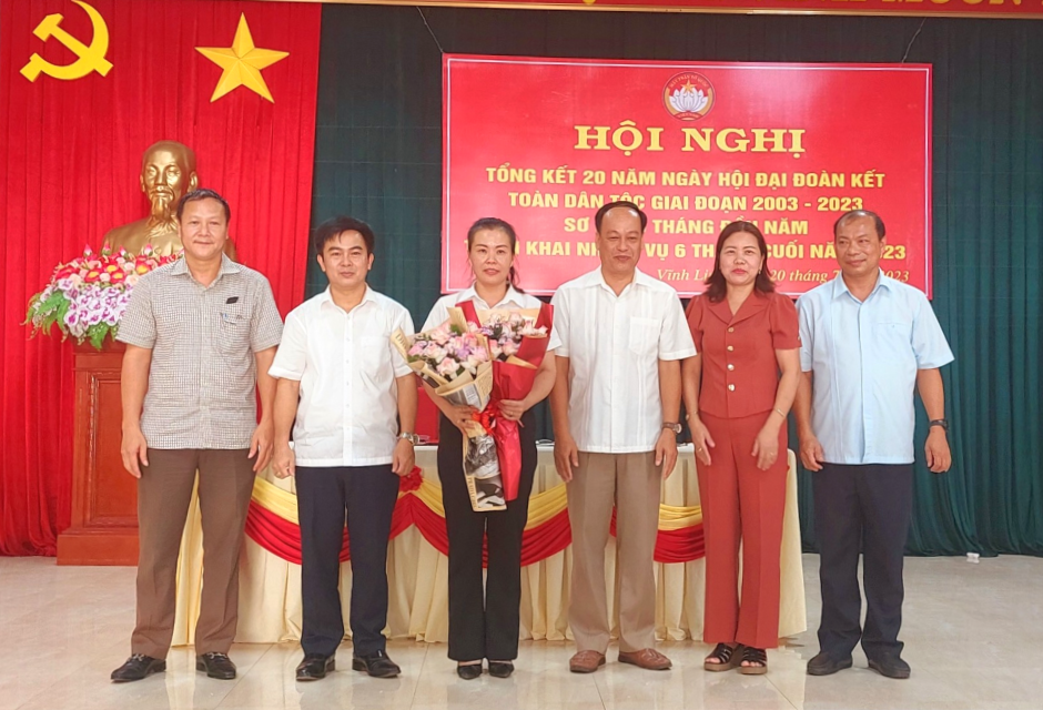 Chiều ngày 20/7/2023, UBMT huyện Vĩnh Linh tổ chức hội nghị tổng kết 20 năm Ngày hội Đại đoàn kết toàn dân tộc giai đoạn 2003- 2023; sơ kết hoạt động 6 tháng đầu năm, triển khai nhiệm vụ 6 tháng cuối năm 2023. Tham dự hội nghị có các đồng chí: Lê Hồng Sơn- Phó Chủ tịch Thường trực UBMT tỉnh, Trần Nhật Quang- Bí thư Huyện ủy; Nguyễn Thị Hương- Phó Bí thư Thường trực Huyện ủy, Chủ tịch HĐND huyện; Thái Văn Thành- Chủ tịch UBND huyện.