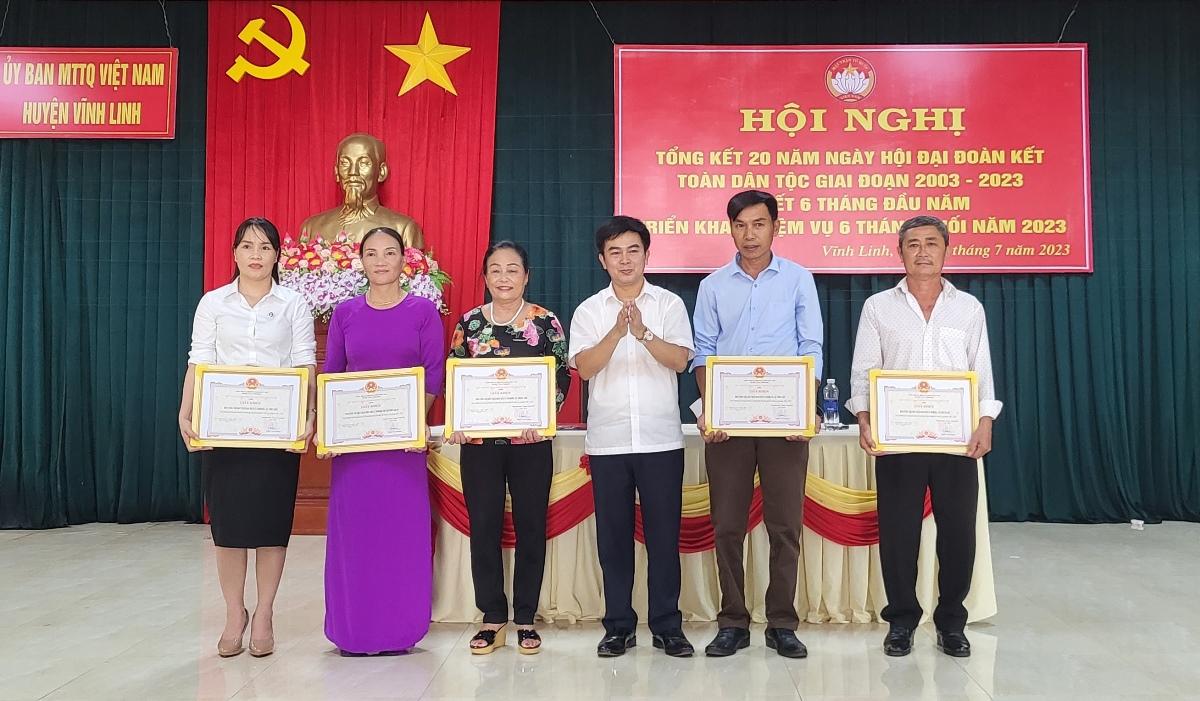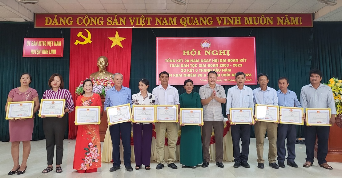 Tại hội nghị tổng kết, huyện Vĩnh Linh đã triển khai một số nhiệm vụ trọng tâm trong thời gian tới nhằm phát huy hơn nữa chất lượng, hiệu quả của Ngày hội Đại đoàn kết toàn dân tộc. Nhân dịp này, huyện Vĩnh Linh biểu dương, khen thưởng cho các tập thể, cá nhân đạt thành tích xuất sắc trong triển khai thực hiện Ngày hội Đại đoàn kết toàn dân tộc.