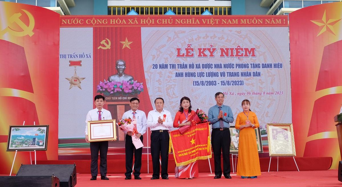 Tại lễ kỷ niệm, Phó Bí thư Thường trực Tỉnh ủy, Chủ tịch HĐND tỉnh Nguyễn Đăng Quang; Phó Chủ tịch Thường trực UBND tỉnh Hà Sỹ Đồng trao Bằng khen của Thủ tướng Chính phủ cho nhân dân và cán bộ thị trấn Hồ Xá đã có thành tích trong công tác góp phần vào sự nghiệp xây dựng XHCN và bảo vệ Tổ quốc; Cờ của Thủ tướng Chính phủ cho Nhân dân và cán bộ thị trấn Hồ Xá đã hoàn thành xuất sắc toàn diện nhiệm vụ công tác dẫn đầu khối phong trào thi đua năm 2022 của tỉnh Quảng Trị.