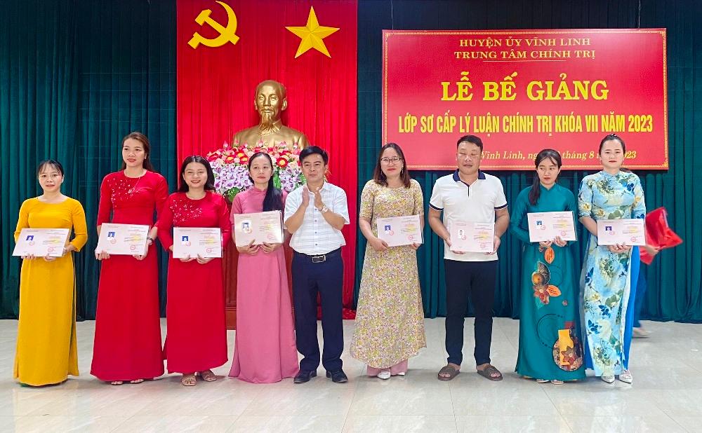 Chiều ngày 8/8/2023, Trung tâm Chính trị huyện Vĩnh Linh đã tổ chức bế giảng lớp sơ cấp lý luận chính trị khóa VII năm 2023. Dự lễ bế giảng có các đồng chí: Trần Nhật Quang - Bí thư Huyện ủy; Trần Thị Thu Hà - Trưởng Ban Tuyên giáo huyện ủy, Giám đốc Trung tâm Chính trị huyện.