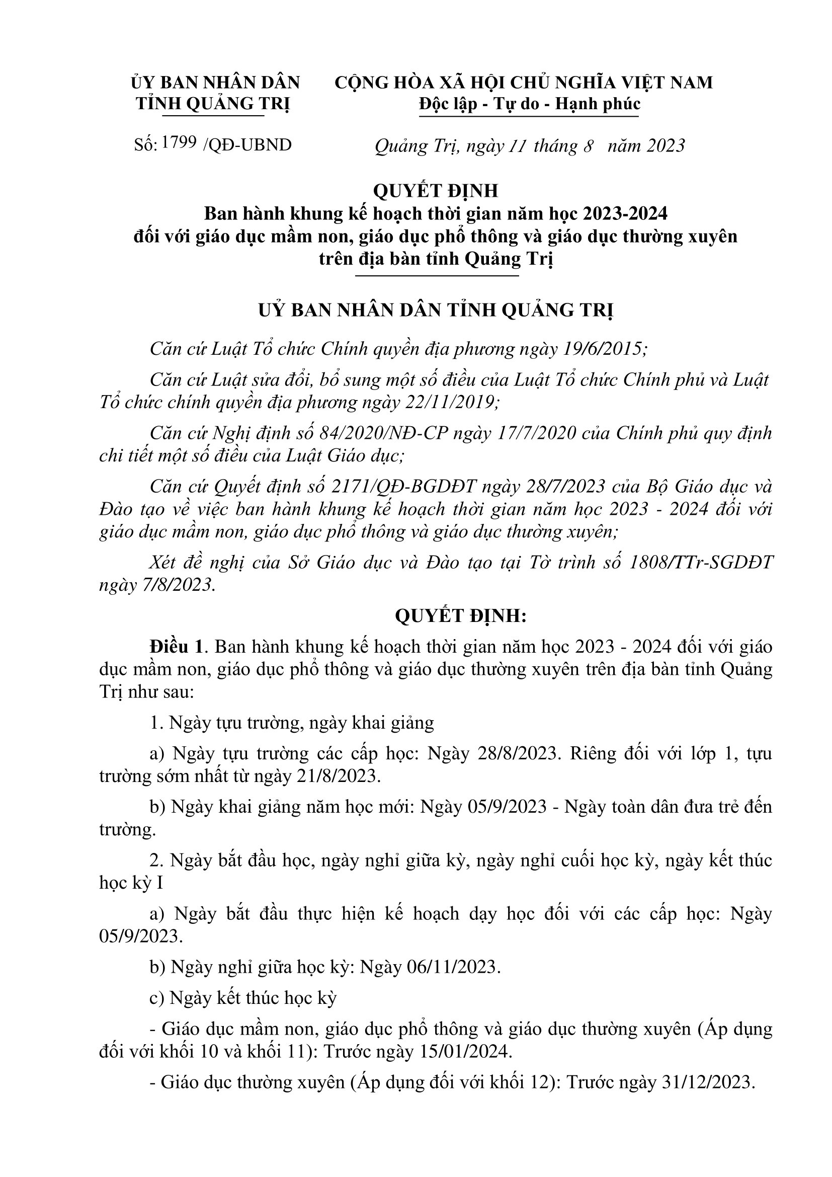 UBND tỉnh Quảng Trị vừa ban hành khung kế hoạch thời gian năm học 2023-2024 đối với giáo dục mầm non, giáo dục phổ thông và giáo dục thường xuyên trên địa bàn tỉnh.