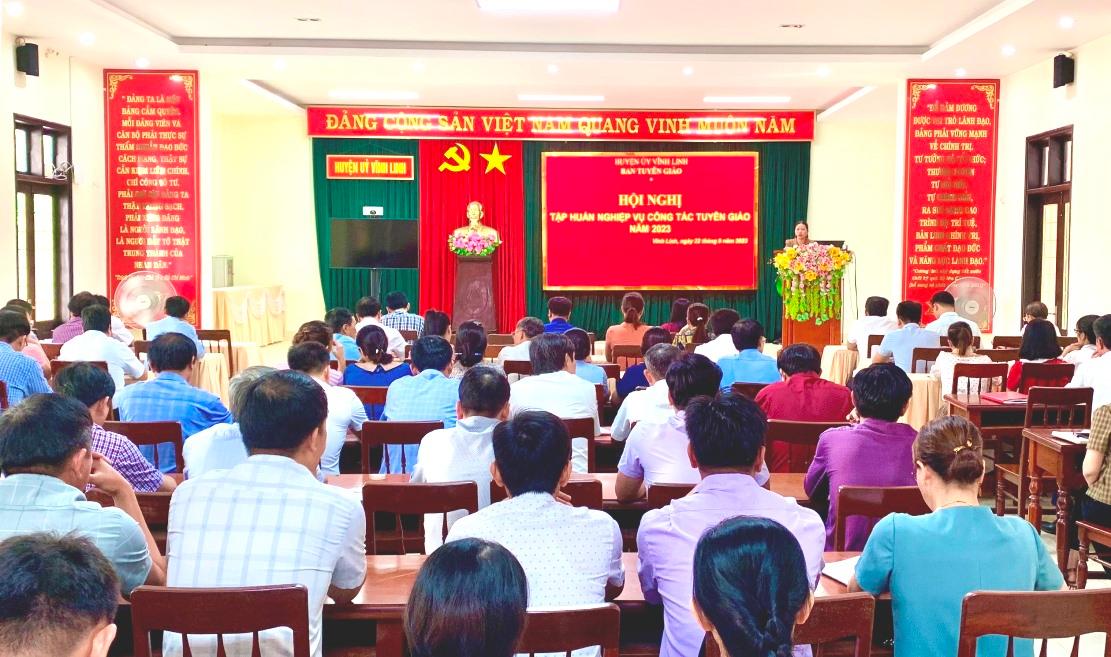 Ngày 22/9/2023, Ban Tuyên giáo Huyện ủy Vĩnh Linh phối hợp với Trung tâm Chính trị huyện tổ chức lớp tập huấn nghiệp vụ công tác tuyên giáo cho đội ngũ cán bộ làm công tác tuyên giáo trong toàn huyện. Tham dự có đồng chí Nguyễn Thị Hương- Phó Bí thư Thường trực Huyện ủy, Chủ tịch HĐND huyện.