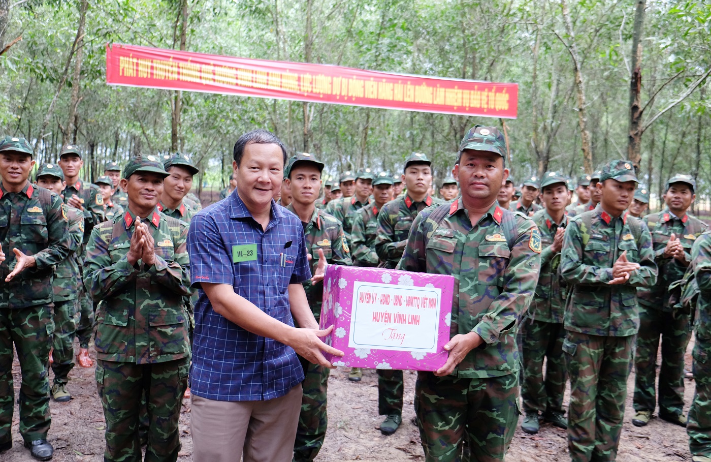 Chủ tịch UBND huyện Vĩnh Linh Thái Văn Thành tặng quà lực lượng QDBĐV tham gia diễn tập.