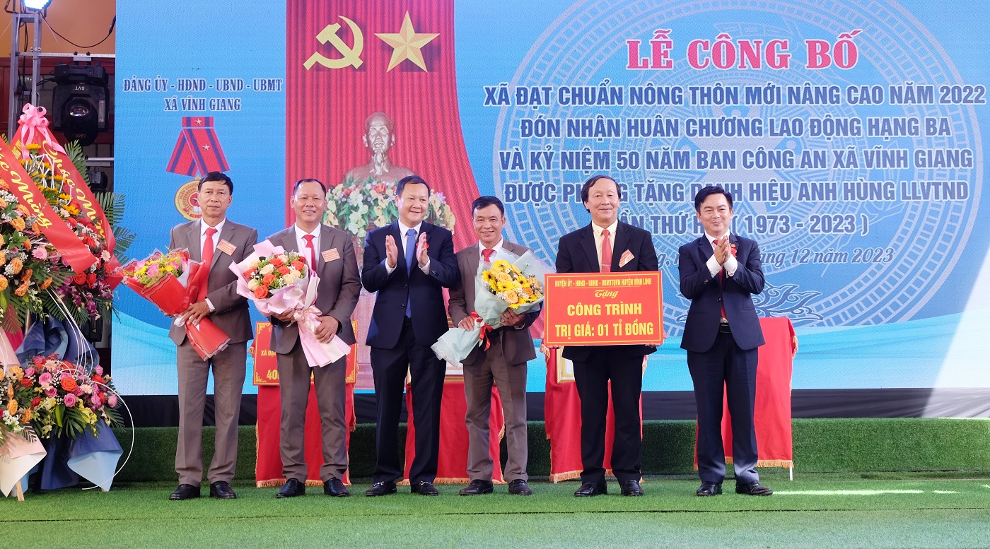 Tại buổi lễ, Phó Chủ tịch UBND tỉnh Lê Đức Tiến đã trao Huân chương Lao động hạng Ba và trao Bằng công nhận xã đạt chuẩn NTM nâng cao năm 2022 cùng công trình trị giá 400 triệu đồng cho Nhân dân và cán bộ xã Vĩnh Giang. UBND huyện Vĩnh Linh đã trao tặng công trình trị giá 1 tỷ đồng cho xã Vĩnh Giang đạt chuẩn NTM nâng cao.