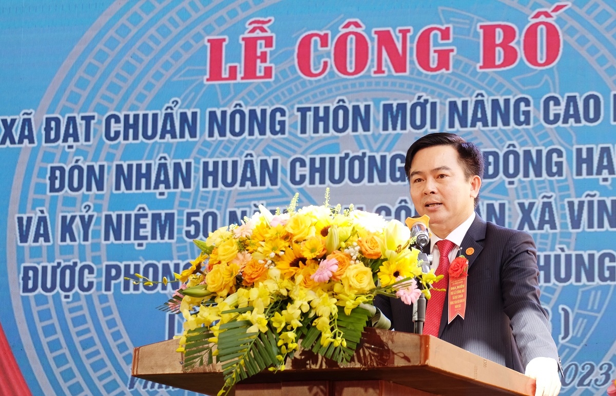Phát biểu tại buổi lễ, đồng chí Trần Nhật Quang, Bí thư Huyện ủy Vĩnh Linh đã chúc mừng và biểu dương những thành tích mà Đảng bộ, Chính quyền và Nhân dân xã Vĩnh Giang đã đạt được. Đồng thời nhấn mạnh, đây là tiền đề quan trọng để xã tiếp tục hướng đến những mục tiêu xa hơn, mà trước mắt là hướng đến xây dựng NTM kiểu mẫu góp phần vào nhiệm vụ xây dựng huyện đạt chuẩn NTM. Trong thời gian tới, xã cần đẩy mạnh quán triệt, nâng cao nhận thức về mục đích, ý nghĩa của chương trình xây dựng NTM nâng cao và NTM kiểu mẫu; tiếp tục duy trì và nâng cao chất lượng các tiêu chí đã đạt được; tập trung phát triển kinh tế; đẩy mạnh ứng dụng KHKTvào mọi lĩnh vực, từ đó không ngừng nâng cao đời sống cho Nhân dân.