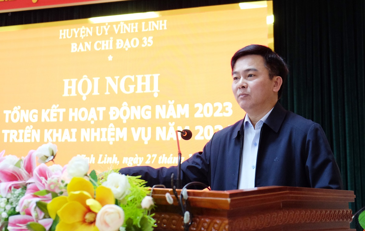 Phát biểu chỉ đạo tại hội nghị, Bí thư Huyện ủy Vĩnh Linh Trần Nhật Quang đã ghi nhận, biểu dương những kế quả đạt được của Ban Chỉ đạo 35 cấp huyện, các TCCSĐ, các cơ quan, đơn vị liên quan. Về nhiệm vụ năm 2024, đồng chí Bí thư Huyện ủy nhấn mạnh đây là năm diễn ra nhiều sự kiện chính trị trọng đại của quê hương, đất nước; năm khởi công nhiều công trình, dự án lớn trên địa bàn tỉnh, huyện, cũng là năm dự báo còn gặp nhiều khó khăn, thách thức.
