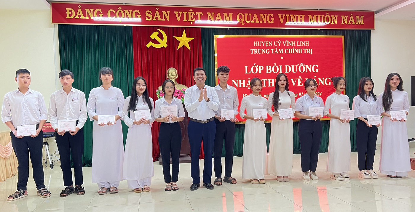 Chiều 13/1/2024, Trung tâm Chính trị huyện Vĩnh Linh tổ chức lễ bế giảng lớp bồi dưỡng nhận thức về Đảng cho 85 học viên khóa I năm 2024. Đây là lớp dành riêng cho các học viên lứa tuổi học sinh THPT; là những học sinh xuất sắc, đoàn viên ưu tú được lựa chọn từ hàng nghìn học sinh THPT trên địa bàn huyện. Đến dự bế giảng có đồng chí Trần Thị Thu Hà- Trưởng Ban Tuyên giáo Huyện ủy, Giám đốc Trung tâm Chính trị huyện.