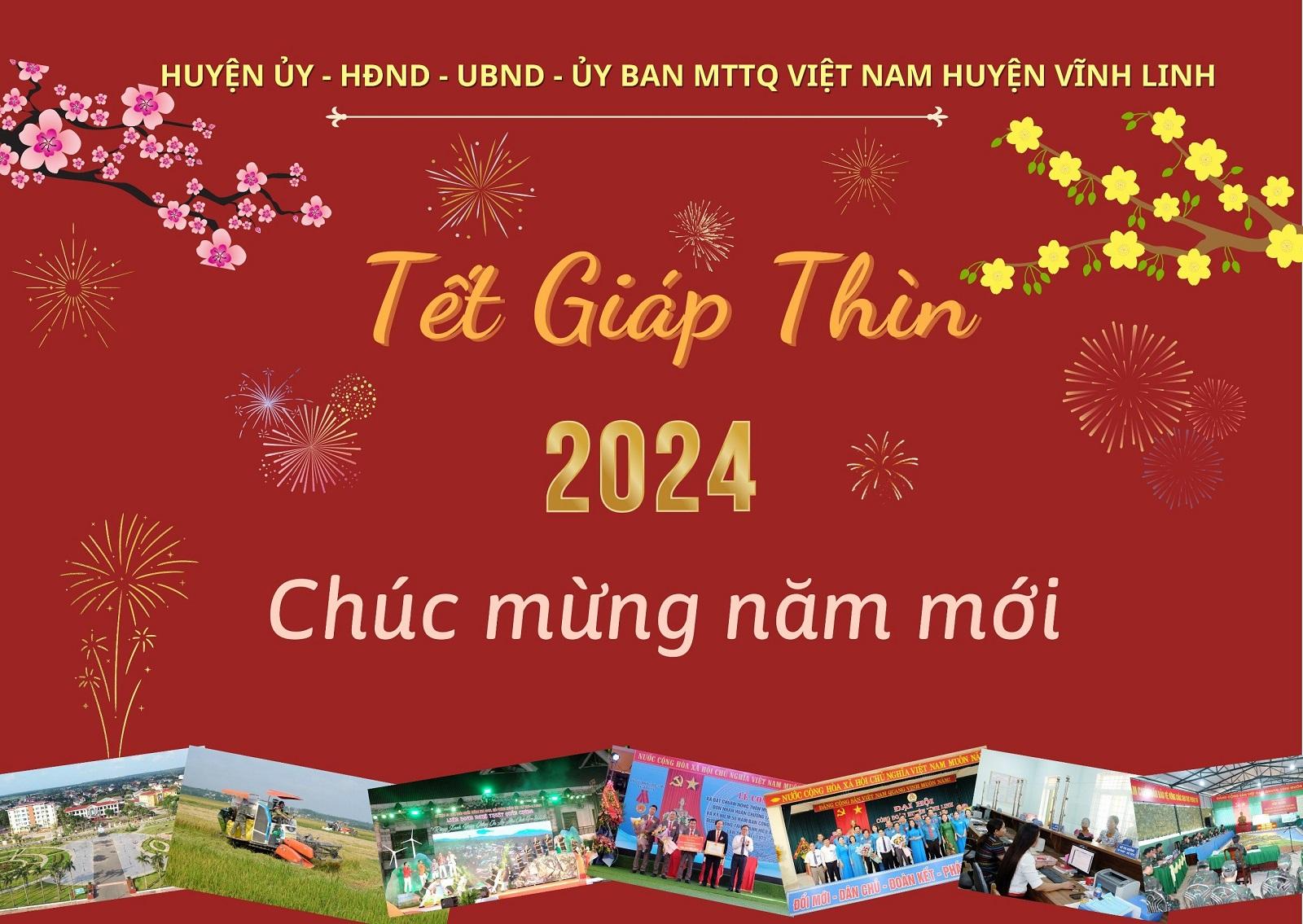 Trong niềm hân hoan, phấn khởi đón chào Xuân mới Giáp Thìn 2024, thay mặt Huyện ủy, HĐND, UBND, UBMTTQ Việt Nam huyện Vĩnh Linh, tôi thân ái gửi tới toàn thể đồng bào, đồng chí, các gia đình thương binh liệt sỹ, gia đình có công với nước, các vị lão thành cách mạng, các Mẹ Việt Nam anh hùng, Anh hùng LLVT, Anh hùng Lao động cùng toàn thể cán bộ, đảng viên, các tầng lớp Nhân dân, lực lượng vũ trang, con em Vĩnh Linh đang sinh sống, học tập, công tác trên khắp mọi miền Tổ quốc và ở nước ngoài một năm mới Mạnh khỏe - Hạnh phúc - Bình an - Thịnh vượng.