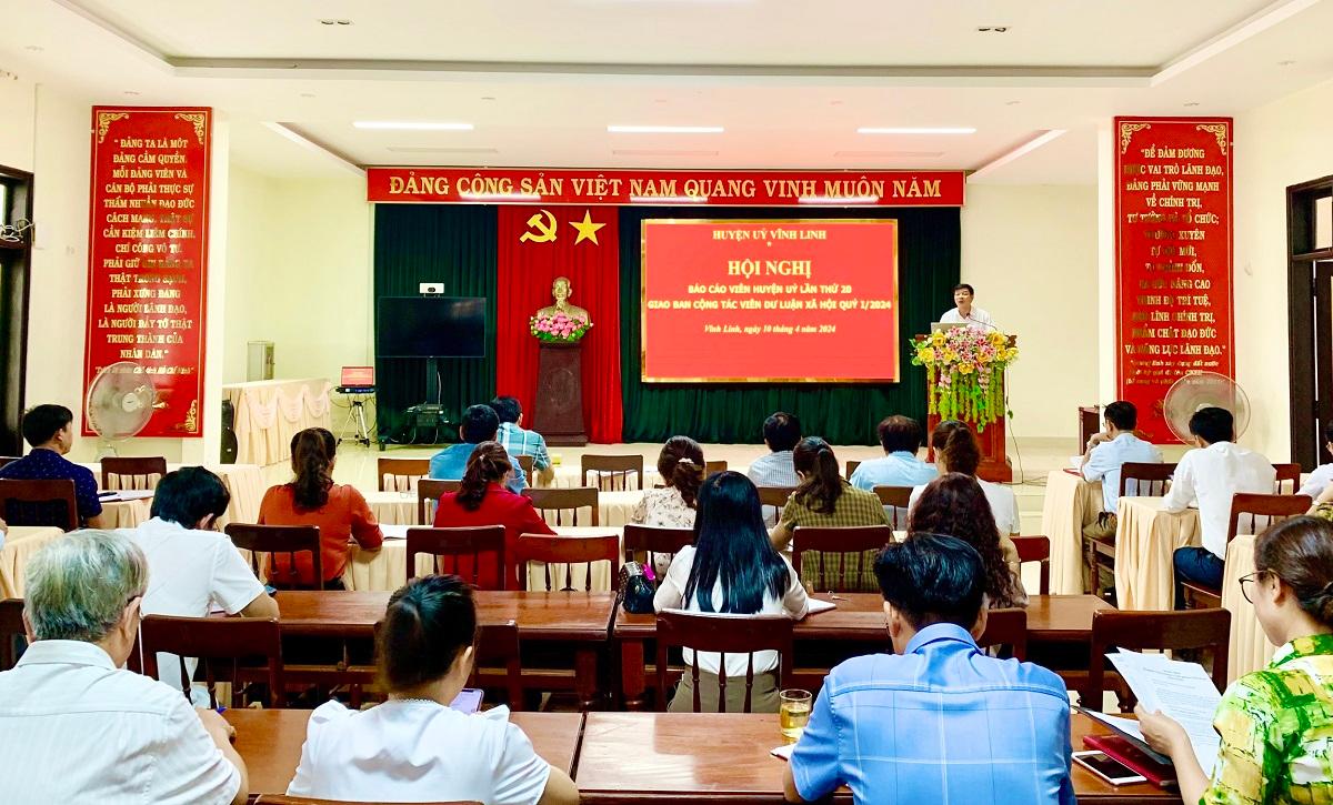 Ngày 10/4/2024, Ban Tuyên giáo Huyện ủy Vĩnh Linh phối hợp với Trung tâm Chính trị huyện tổ chức hội nghị báo cáo viên Huyện ủy lần thứ 20 và giao ban CTV dư luận xã hội quý 1/2024. Tham dự có đồng chí Nguyễn Thị Hương- Phó Bí thư Thường trực Huyện ủy.