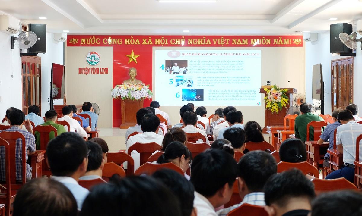 Ngày 12/4/2024, huyện Vĩnh Linh tổ chức kết nối trực tuyến hội nghị giới thiệu, phổ biến Luật Đất đai số 31/2024/QH15 do UBND tỉnh Quảng Trị tổ chức. Tham dự tại điểm cầu UBND huyện Vĩnh Linh có đồng chí Nguyễn Thị Hương- Phó Bí thư Thường trực Huyện ủy, Chủ tịch HĐND huyện.