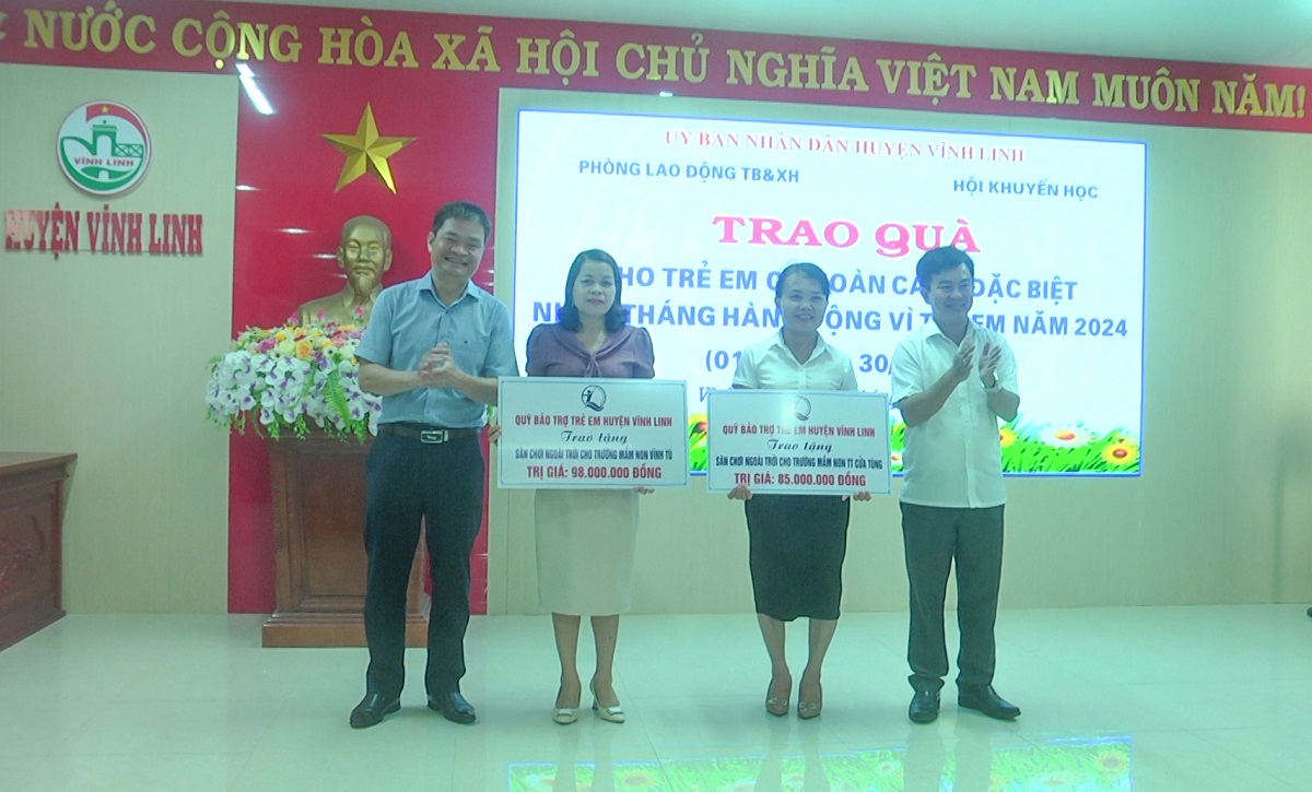 Tại chương trình, lãnh đạo huyện Vĩnh Linh đã trao 40 suất bảo trợ dài hạn đợt 1 cho 40 học sinh có hoàn cảnh đặc biệt khó khăn với số tiền 1,2 triệu đồng/em; trao đỡ đầu cho 4 học sinh được 2 gia đình hảo tâm tại Thành phố Hà Nội và Đà Nẵng tài trợ, với số tiền 3 triệu đồng/em; trao 8 thẻ Bảo hiểm y tế các em học sinh tại các trường. Đồng thời, trao tặng 2 công trình “Sân chơi cho em” cho trường Mầm non Vĩnh Tú và Mầm non Vĩnh Thái, với tổng giá trị 183 triệu đồng.