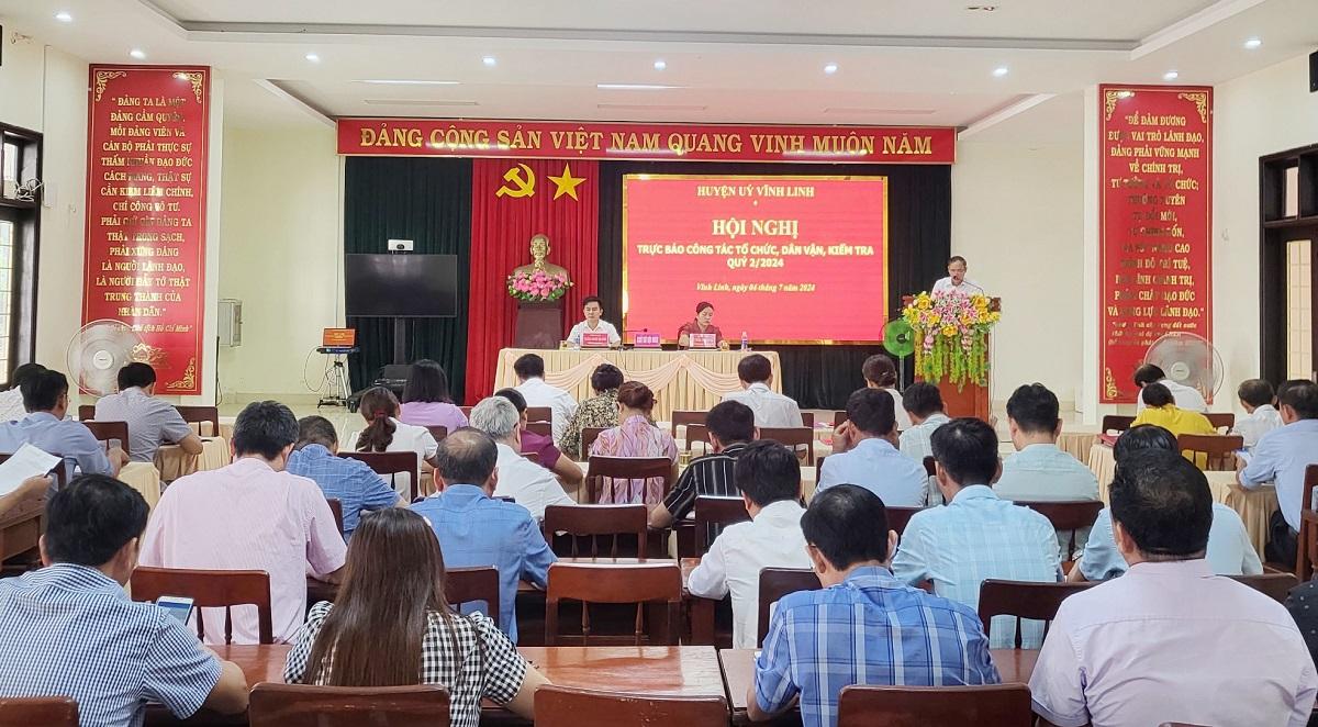 Ngày 4/7/2024, Huyện ủy Vĩnh Linh tổ chức hội nghị trực báo công tác tổ chức, dân vận, kiểm tra quý 2/2024. Đồng chí Trần Nhật Quang - Bí thư Huyện ủy; Nguyễn Thị Hương - Phó Bí thư Thường trực Huyện ủy, Chủ tịch HĐND huyện chủ trì hội nghị.