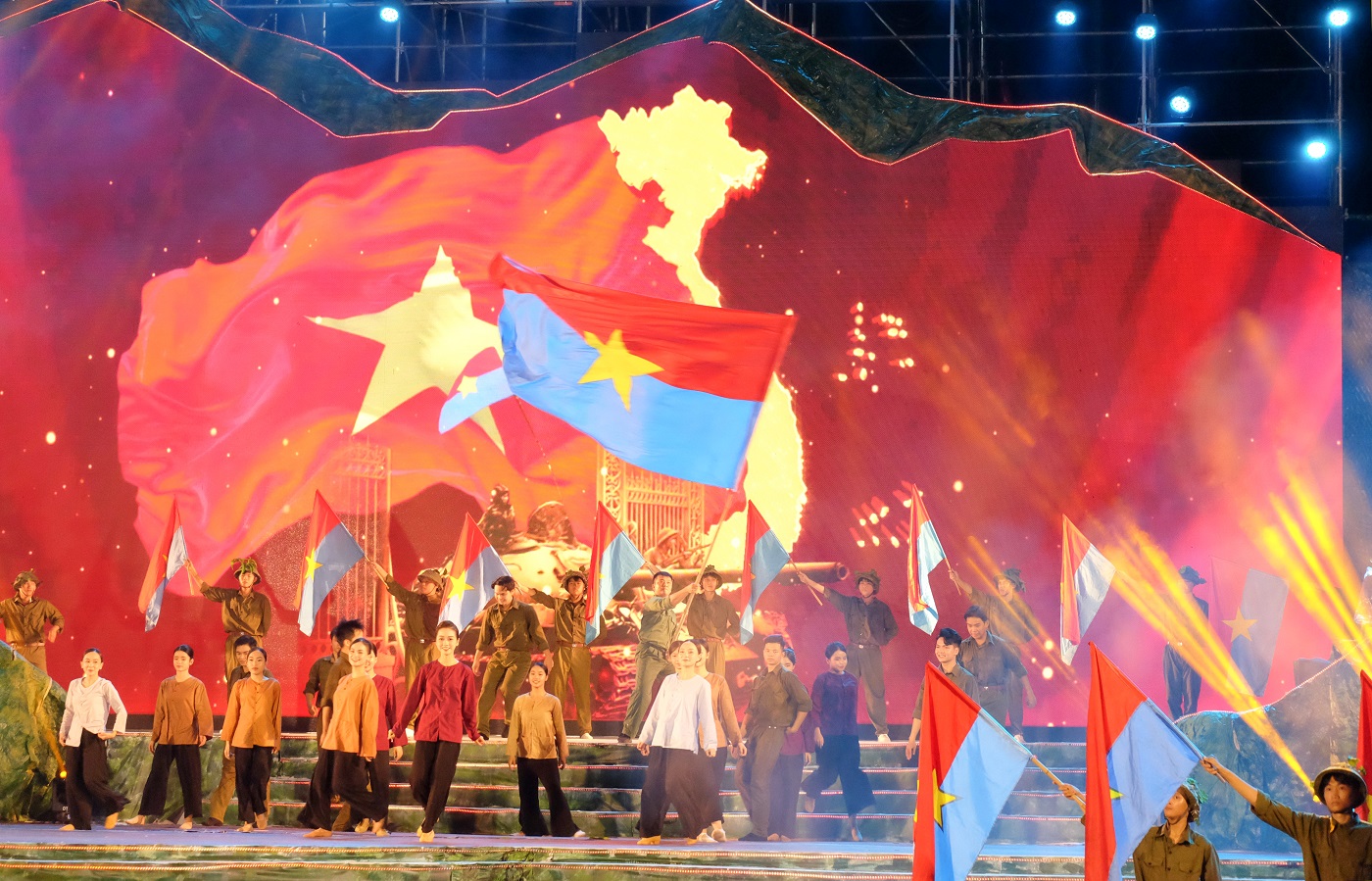 Cùng với phần lễ, chương trình nghệ thuật được gian dựng công phu, hoành tráng với 5 chương: Những ngày tháng 7, Như không hề có cuộc chia ly, Máu vào hoa, Nơi nhìn ra sức mạnh Việt Nam và Đất thép nở hoa. Điểm nhấn là hai vở kịch ngắn “Chung một màu da” và “Chúng ta là người nhà” do Nhà báo Trần Đăng Tuấn- nguyên Phó Tổng Giám đốc Đài Truyền hình Việt Nam viết kịch bản.
