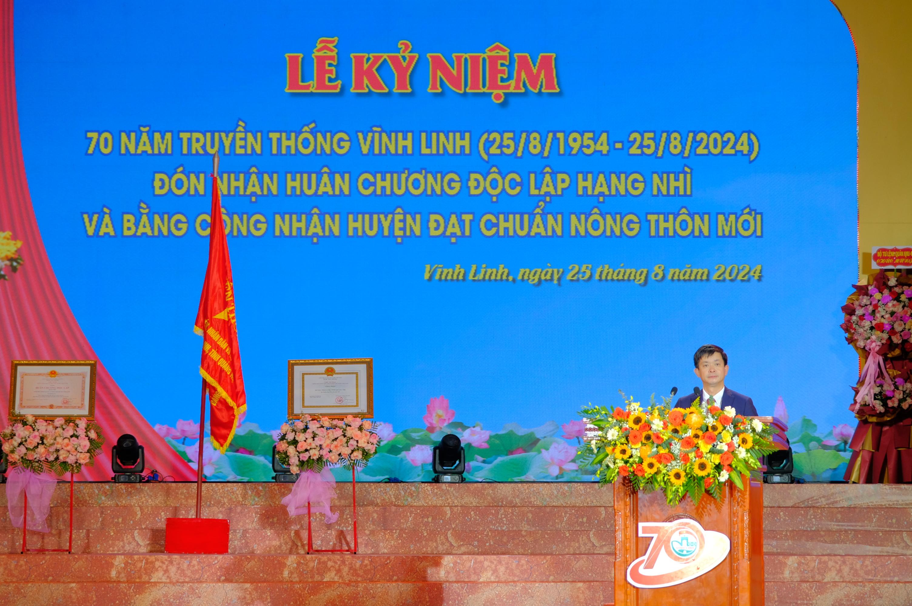 Trong không khí hào hùng của những ngày tháng 8 mùa thu lịch sử và hướng đến kỷ niệm 79 năm ngày Quốc khánh 2-9, hôm nay chúng ta có mặt tại đây, trên mảnh đất “Lũy thép anh hùng” để long trọng kỷ niệm 70 năm truyền thống Vĩnh Linh (25/8/1954 - 25/8/2024), đón nhận Huân chương Độc lập hạng Nhì và huyện đạt chuẩn nông thôn mới.