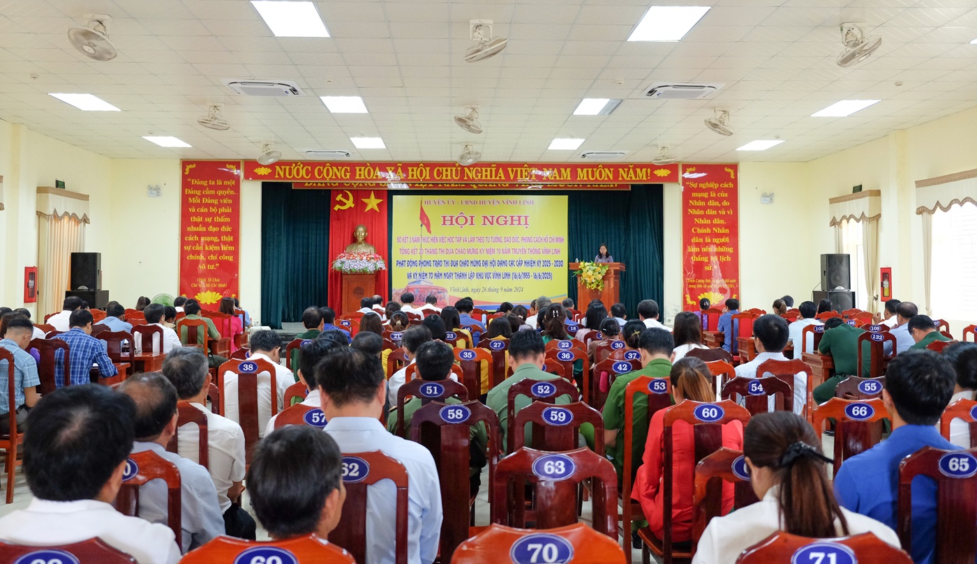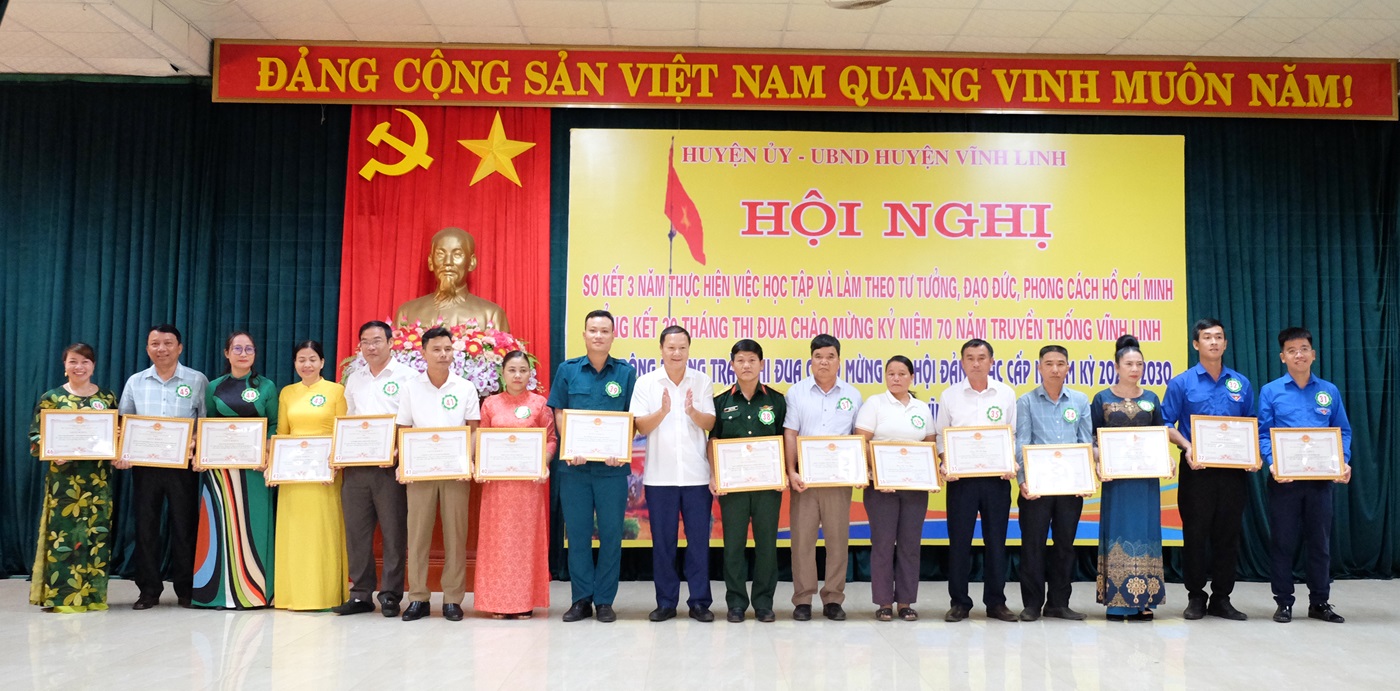 Ngày 26/9/2024, huyện Vĩnh Linh tổ chức hội nghị sơ kết 3 năm thực hiện việc học tập và làm theo tư tưởng, đạo đức, phong cách Hồ Chí Minh; tổng kết 20 tháng thi đua chào mừng kỷ niệm 70 năm truyền thống Vĩnh Linh 25/8 (1954 - 2024); phát động phong trào thi đua chào mừng Đại hội Đảng các cấp nhiệm kỳ 2025 - 2030 và kỷ niệm 70 năm ngày thành lập Khu vực Vĩnh Linh 16/6 (1955 - 2025). Tham dự có các đồng chí: Trần Nhật Quang - Bí thư Huyện ủy; Nguyễn Thị Hương - Phó Bí thư Thường trực Huyện ủy, Chủ tịch HĐND huyện; Thái Văn Thành - Chủ tịch UBND huyện.