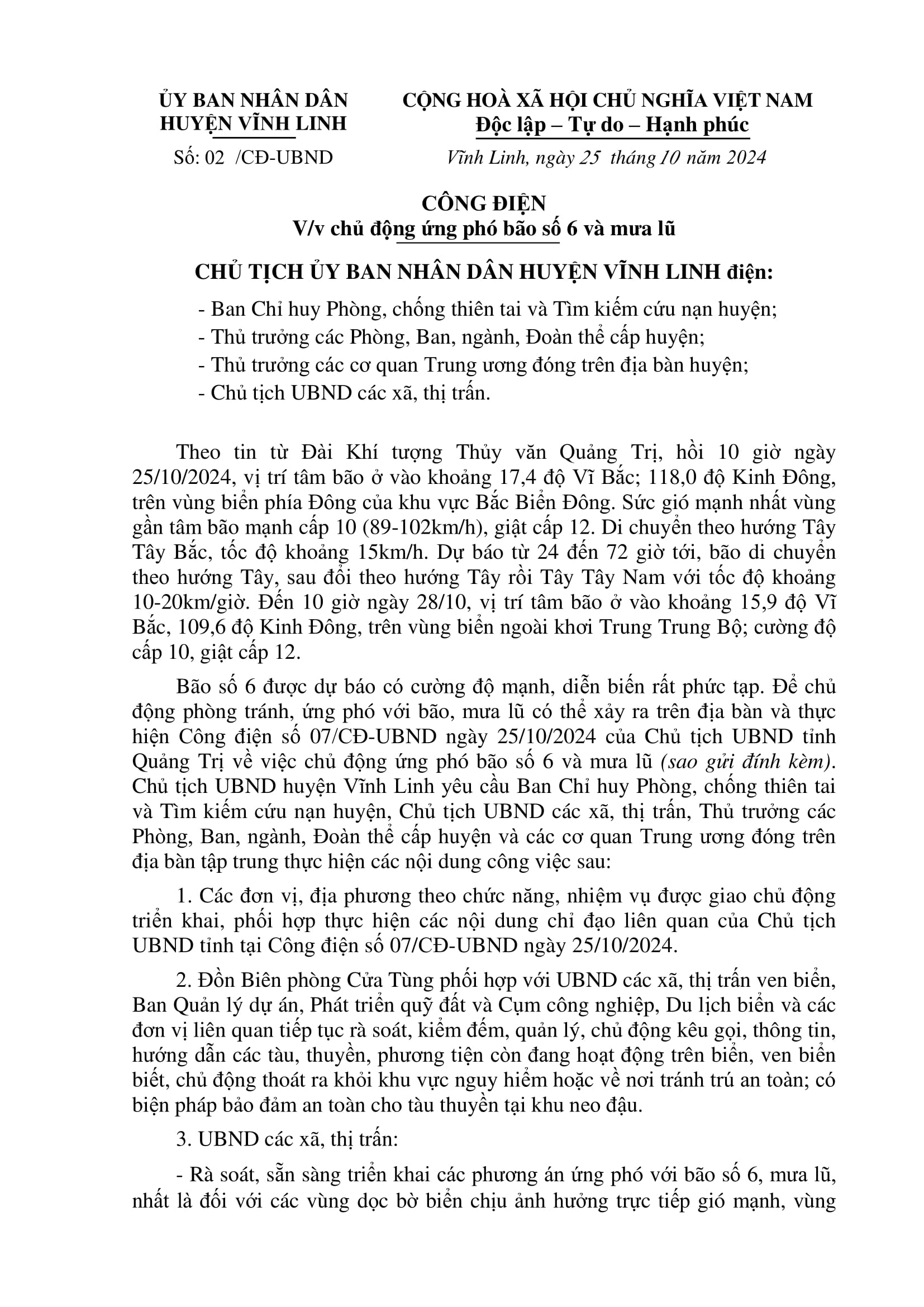 Ngày 25/10/2024, Chủ tịch UBND huyện Vĩnh Linh có Công điện về chủ động ứng phó bão số 6 và mưa lũ.