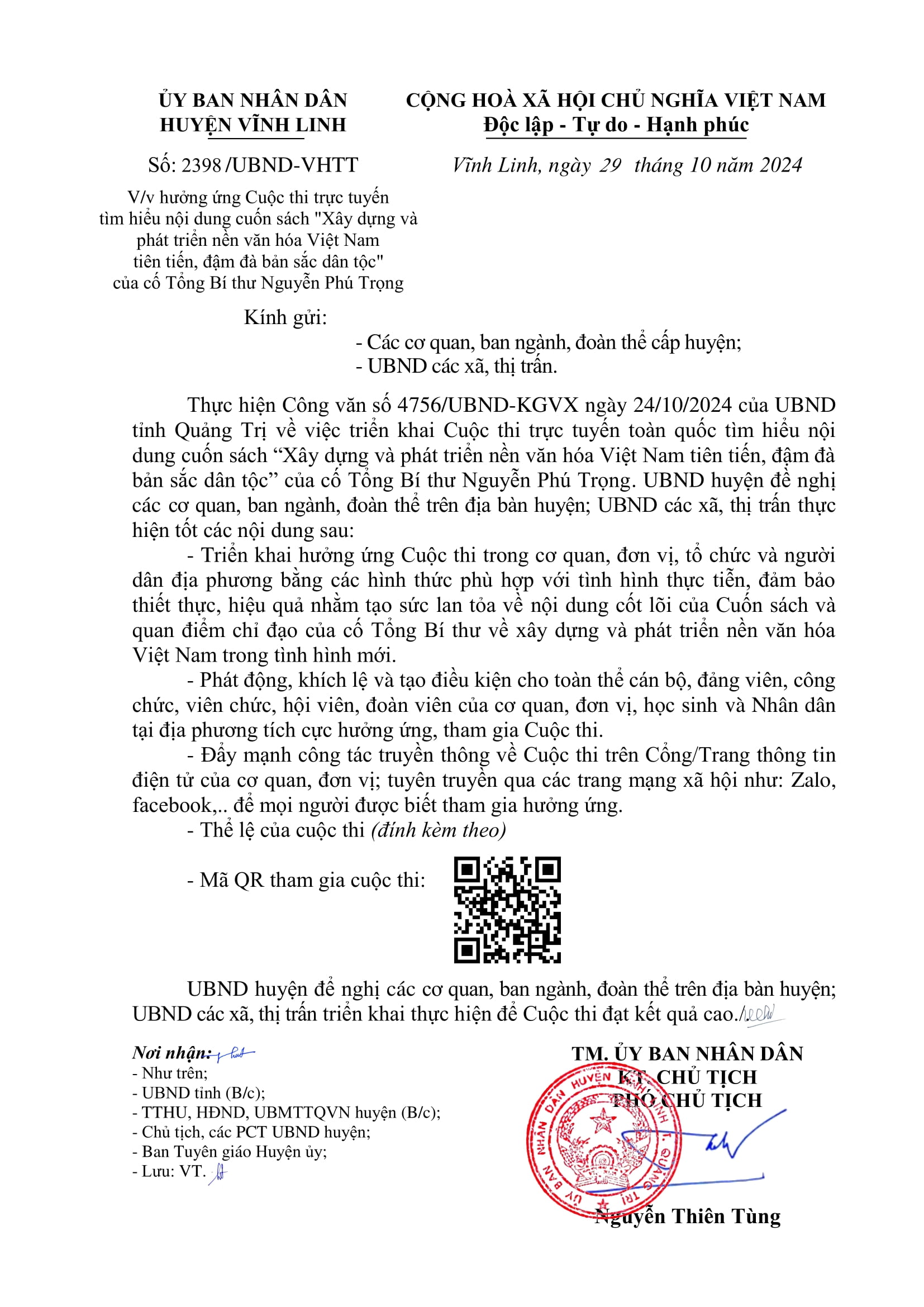 Ngày 29/10/2024, UBND huyện Vĩnh Linh có văn bản đề nghị các cơ quan, ban ngành, đoàn thể trên địa bàn huyện; UBND các xã, thị trấn triển khai hưởng ứng Cuộc thi trực tuyến tìm hiểu nội dung cuốn sách "Xây dựng và phát triển nền văn hóa Việt Nam tiên tiến, đậm đà bản sắc dân tộc" của cố Tổng Bí thư Nguyễn Phú Trọng bằng các hình thức phù hợp với tình hình thực tiễn, đảm bảo thiết thực, hiệu quả nhằm tạo sức lan tỏa về nội dung cốt lõi của Cuốn sách và quan điểm chỉ đạo của cố Tổng Bí thư về xây dựng và phát triển nền văn hóa Việt Nam trong tình hình mới.