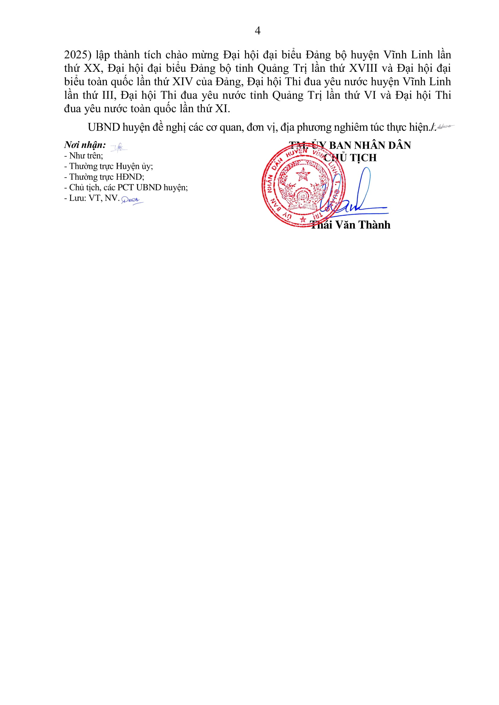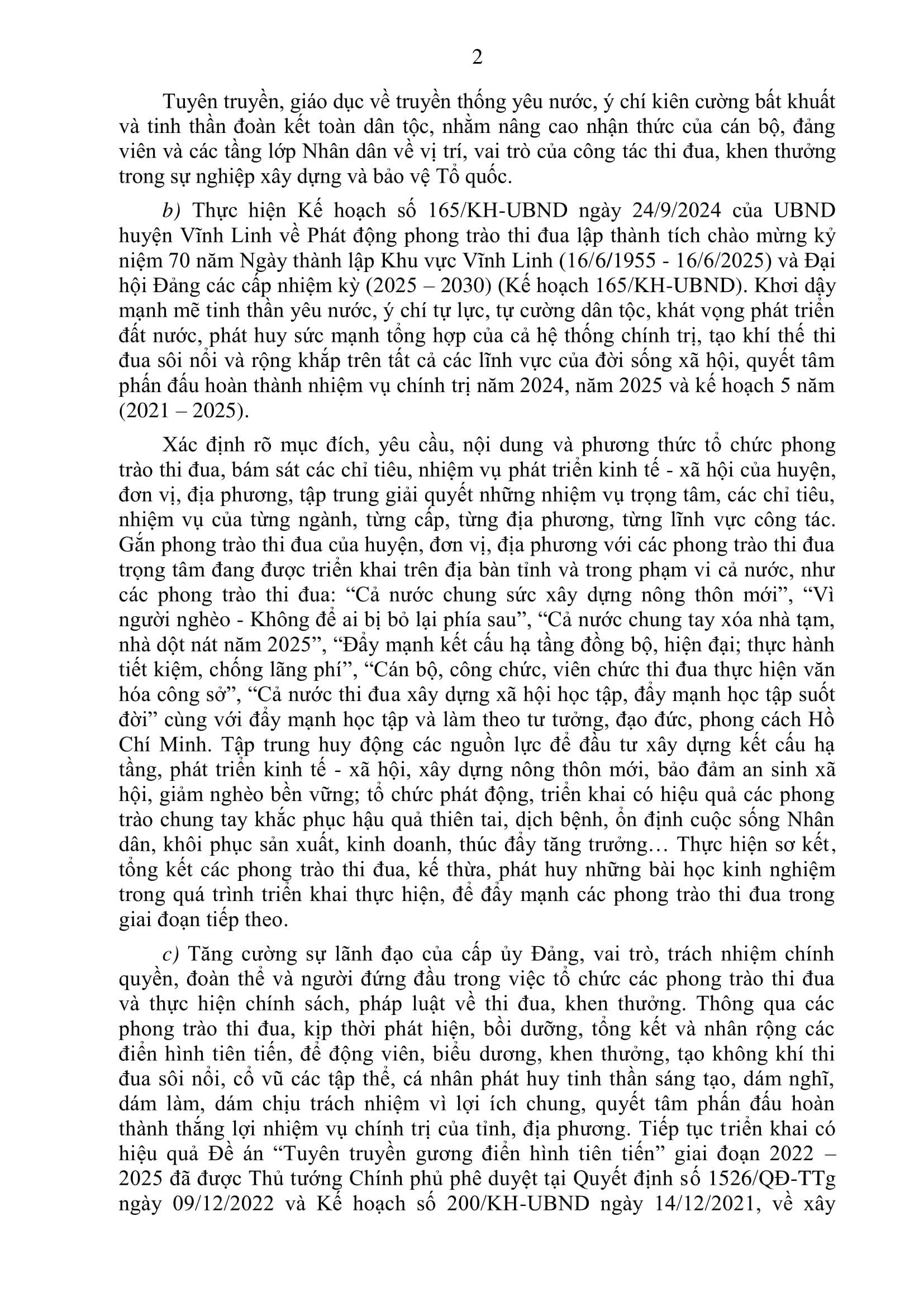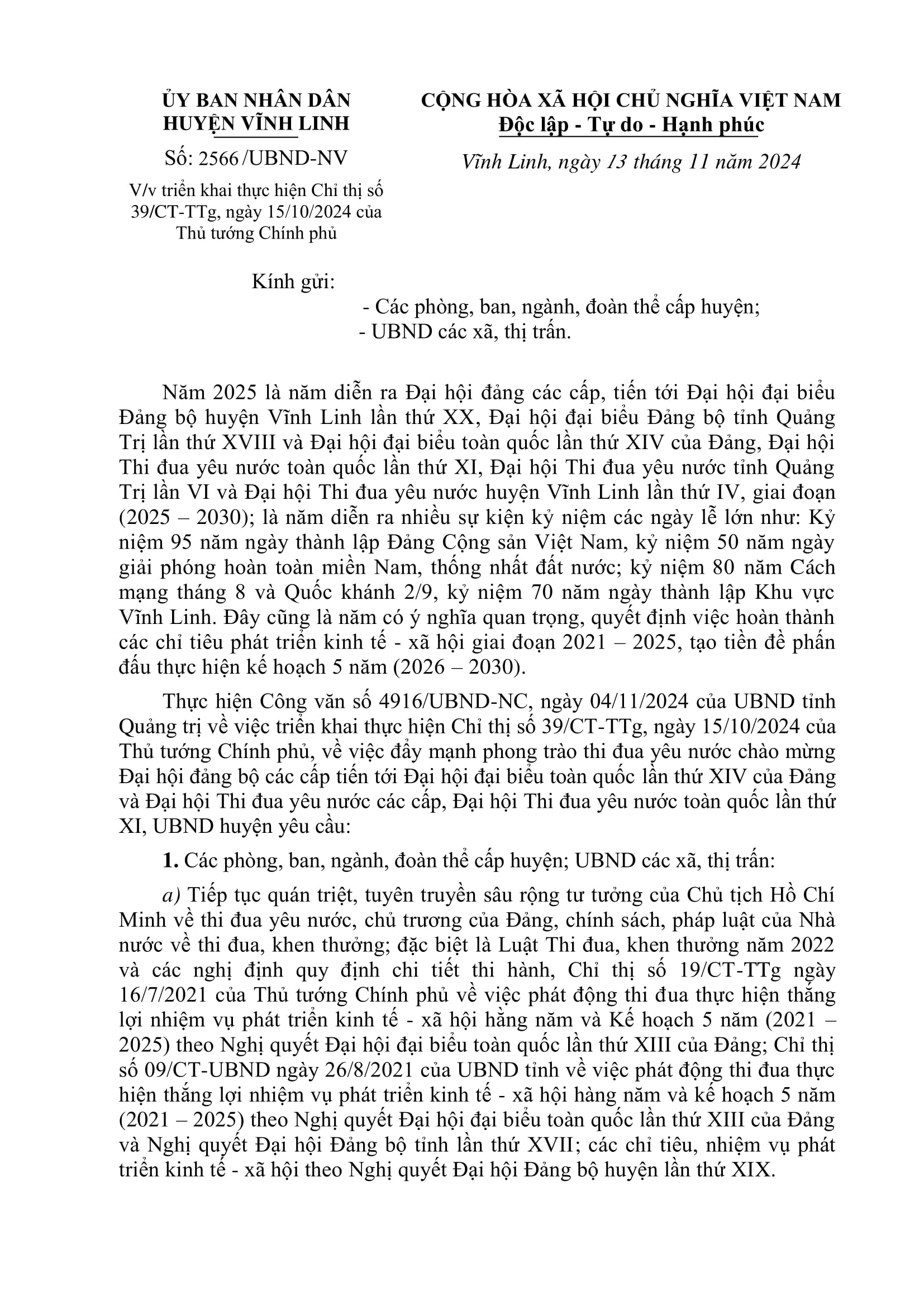 Ngày 13/11/2024, UBND huyện Vĩnh Linh có văn bản triển khai thực hiện Chỉ thị số 39/CT-TTg, ngày 15/10/2024 của Thủ tướng Chính phủ về đẩy mạnh phong trào thi đua yêu nước chào mừng Đại hội đảng bộ các cấp tiến tới Đại hội đại biểu toàn quốc lần thứ XIV của Đảng, Đại hội Thi đua yêu nước toàn quốc lần thứ XI.