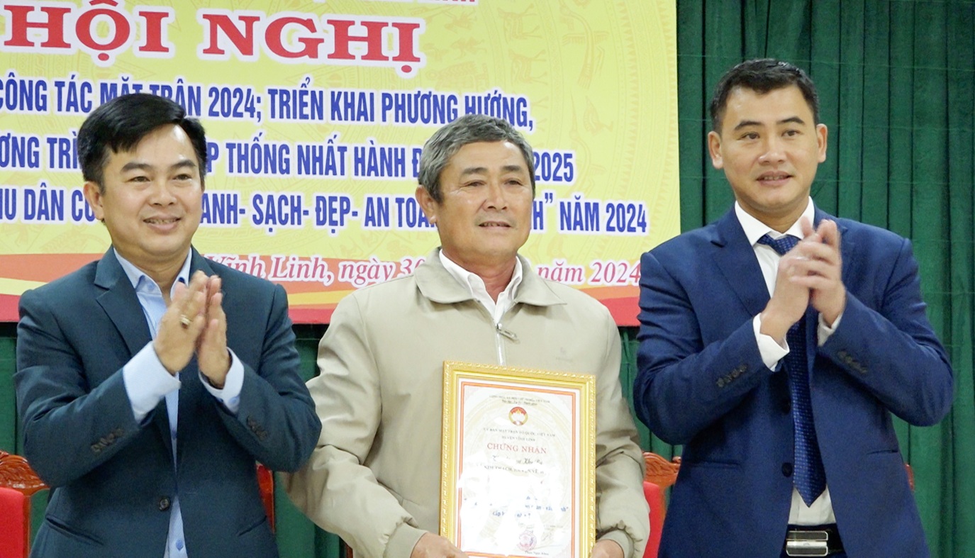 Nhân dịp này, UBMT huyện Vĩnh Linh đã tiến hành trao giải thưởng Hội thi “Khu dân cư sáng, xanh, sạch, đẹp, an toàn, văn minh cấp huyện năm 2024”; trao kỷ niệm chương vì sự nghiệp đại đoàn kết toàn dân tộc; biểu dương, khen thưởng cho nhiều tập thể và cá nhân vì đã đạt những thành tích xuất sắc trong công tác mặt trận thời gian qua.