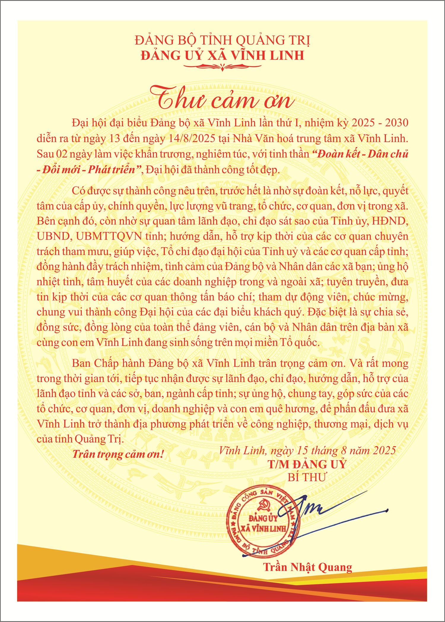 Trong hai ngày 13- 14/8/2025, tại Nhà Văn hóa trung tâm xã, Đại hội Đại biểu Đảng bộ xã Vĩnh Linh lần thứ I, nhiệm kỳ 2025- 2030 đã diễn ra và thành công tốt đẹp. Nhân dịp này, Đảng ủy xã trân trọng gửi thư cảm ơn tới các tổ chức, đơn vị, cán bộ, đảng viên, Nhân dân trên địa bàn và con em quê hương Vĩnh Linh đang sinh sống, công tác trên mọi miền Tổ quốc.