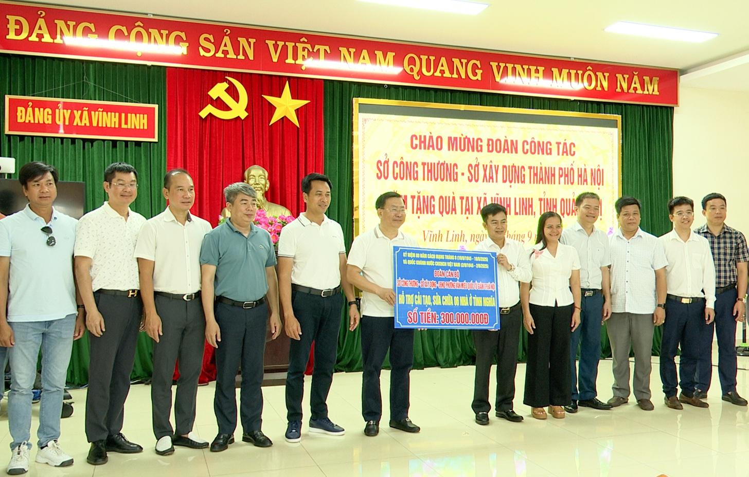 Trong buổi làm việc, Đoàn công tác đã trao bảng tượng trưng kinh phí 300 triệu đồng hỗ trợ xã Vĩnh Linh sửa chữa 6 căn nhà tình nghĩa cho các hộ gia đình chính sách, người có công và người có hoàn cảnh khó khăn.
