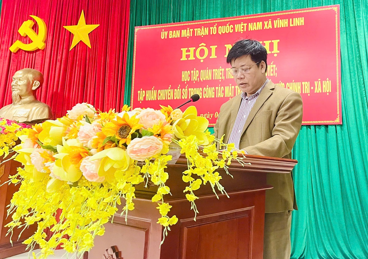 Phát biểu tại hội nghị, Chủ tịch UBMT xã Vĩnh Linh, Trần Minh Thiết nhấn mạnh: “Đây là hội nghị có ý nghĩa đặc biệt quan trọng, nhằm thống nhất nhận thức, ý chí và hành động trong đội ngũ cán bộ Mặt trận và các đoàn thể để sớm đưa Nghị quyết vào cuộc sống. Đồng chí đề nghị các đại biểu phát huy tinh thần trách nhiệm cao nhất, tập trung nghiên cứu, trao đổi, vận dụng sáng tạo kết quả học tập Nghị quyết vào thực tiễn công tác.”
