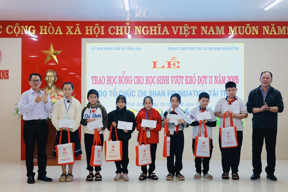 Ngày 05/12/2025, UBND xã Vĩnh Linh phối hợp với Trung tâm công tác xã hội Nam Quảng Trị và tổ chức Zhishan Foundation Taiwan tổ chức trao học bổng đợt II năm 2025 cho học sinh hoàn cảnh khó khăn vượt khó trong học tập.
