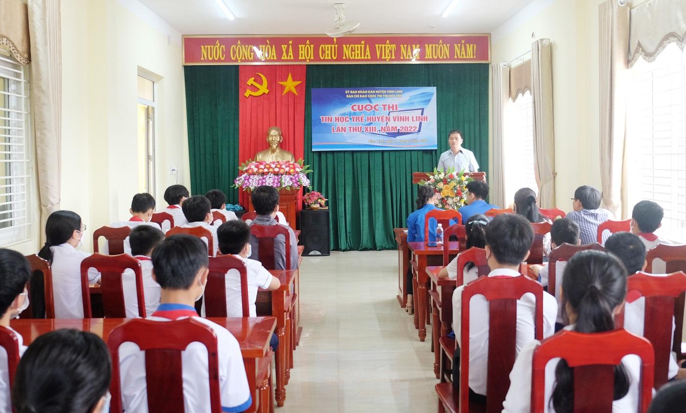 Ngày 14/5, huyện Vĩnh Linh tổ chức cuộc thi “Tin học trẻ" lần thứ 13 năm 2022 với sự tham gia của 46 thí sinh đến từ các trường Tiểu học và THCS trên địa bàn huyện. Đến dự lễ khai mạc có Phó Chủ tịch UBND huyện Nguyễn Thiên Tùng.