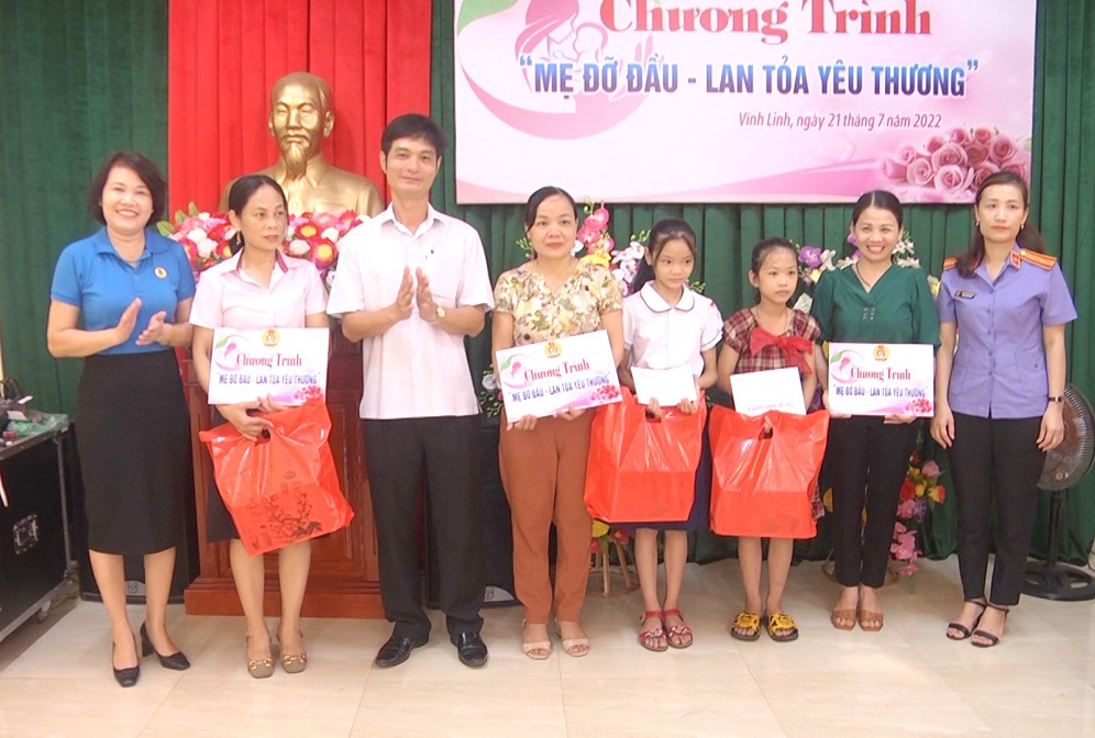 * Ngày 21/7/2022, LĐLĐ huyện Vĩnh Linh cũng đã tổ chức Chương trình “Mẹ đỡ đầu - Lan tỏa yêu thương”, trao hỗ trợ cho các cháu có hoàn cảnh khó khăn là con em của đoàn viên công đoàn trên địa bàn huyện. Đây là chương trình do Hội LHPN Việt Nam phát động và được LĐLĐ các cấp cùng đồng hành thực hiện.
