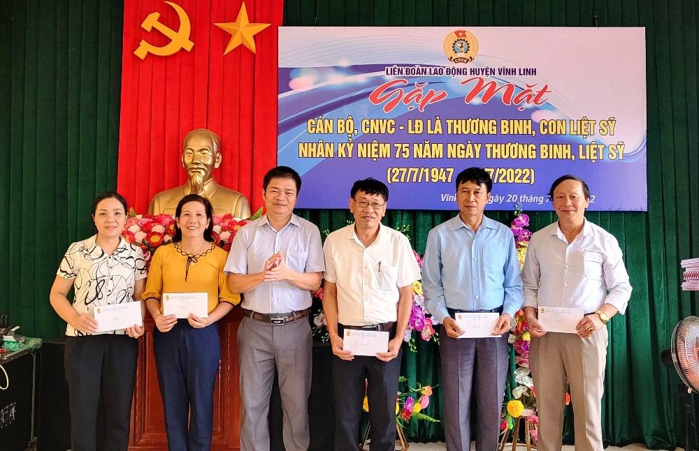 Hiện nay,, huyện Vĩnh Linh có 34 cán bộ, công nhân viên chức- lao động là thương binh, con liệt sỹ đang công tác tại các cơ quan, địa phương, đơn vị. Nhân kỷ niệm 75 năm Ngày Thương binh- Liệt sỹ, từ nguồn xã hội hóa và sự đóng góp của lực lượng đoàn viên công đoàn, LĐLĐ huyện Vĩnh Linh đã tổ chức gặp mặt và trao hỗ trợ cho cán bộ, công nhân viên chức- lao động là thương binh, con liệt sỹ. Mỗi suất trị giá 500 ngàn đồng.