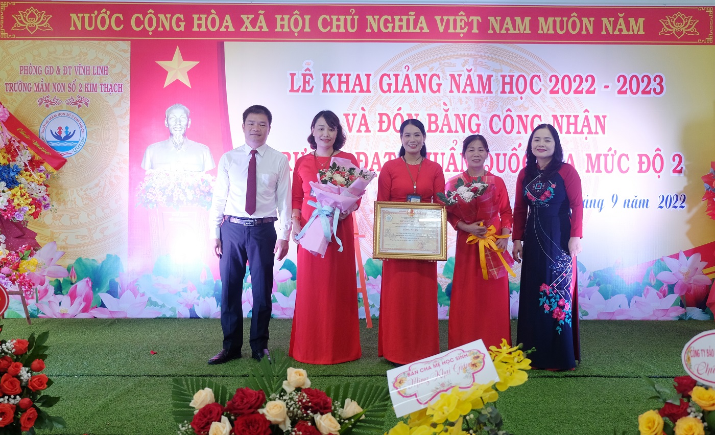 Ngày 1/9/2022, trường Mầm non số 2 Kim Thạch tổ chức khai giảng năm học 2022- 2023 và đón bằng công nhận trường đạt chuẩn Quốc gia mức độ 2. Đây là trường học đầu tiên trên địa bàn huyện Vĩnh Linh tổ chức khai giảng năm học 2022- 2023. Đến dự có Giám đốc Sở Giáo dục và Đào tạo Lê Thị Hương, Phó Chủ tịch UBND huyện Vĩnh Linh Nguyễn Thiên Tùng.