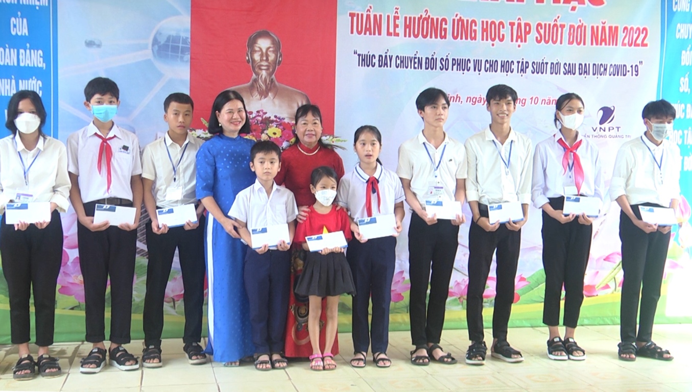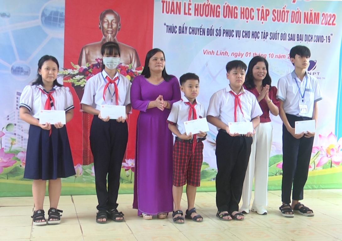 Nhân dịp này, Hội Khuyến học huyện Vĩnh Linh đã trao 10 suất quà cho học sinh có thành tích xuất sắc trong năm học 2022-2023, đơn vị VNPT Quảng Trị trao hỗ trợ 10 suất quà cho các em học sinh có hoàn cảnh khó khăn trên địa bàn huyện.