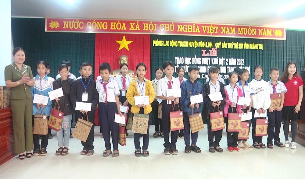 Đợt này, huyện Vĩnh Linh có 73 học sinh được trao học bổng. Theo đó, học sinh cấp TH và THCS nhận được 600 ngàn đồng/suất, học sinh cấp THPT nhận được 800 ngàn đồng/suất; đồng thời mỗi suất được kèm thêm 1 phần sách trị giá 300 ngàn đồng. Ngoài ra, các em có thành tích học tập khá giỏi, đạt giải cao trong kỳ thi các cấp cũng được tặng phần thưởng có giá trị từ 100-150 ngàn đồng; các em học sinh chuyển cấp từ lớp 9 lên 10 được nhận phần quà động viên trị giá 500 ngàn đồng/suất.