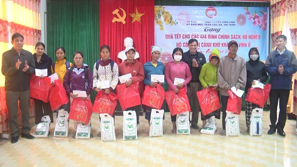 Nhân dịp chuẩn bị đón Tết Nguyên Đán Quý Mão 2023, UBMT huyện Vĩnh Linh và các xã, thị trấn đã trao tặng 90 suất quà cho các gia đình chính sách, hộ nghèo, gia đình có hoàn cảnh khó khăn, những người yếu thế trong xã hội một phần quà. Mỗi phần quà trị giá 500 nghìn đồng, trong đó gồm 300 nghìn đồng tiền mặt và quà tặng trị giá 200 nghìn đồng.