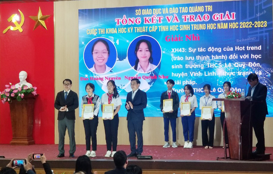 Kết quả, Dự án “Sự tác động của Hot trend (trào lưu thịnh hành) đối với học sinh trường THCS Lê Quý Đôn, huyện Vĩnh Linh thực trạng và giải pháp” đạt giải Nhì; Dự án “Vườn hoa cúc tự hành dựa trên Kết nối vạn vật và Trí tuệ nhân tạo” và “Thùng rác đa năng trong trường học” của học sinh trường THCS Nguyễn Trãi đều đạt giải Ba. Dự án “Mô hình câu lạc bộ 3R - giải pháp nâng cao nhận thức bảo vệ môi trường ven biển của học sinh trường THCS Vĩnh Thái” đạt giải Tư.