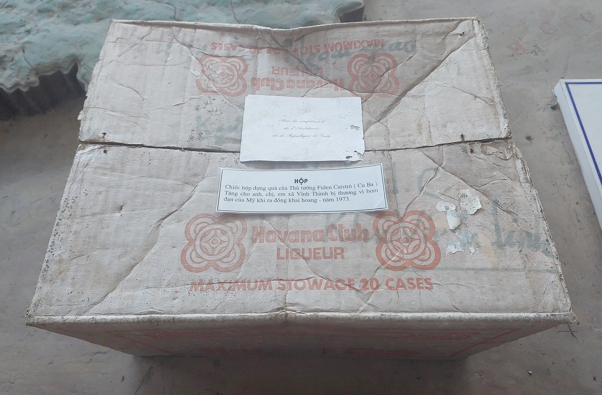 Hộp quà của Chủ tịch Cuba Fidel Castro tặng người dân xã Vĩnh Thành, Vĩnh Linh bị thương vì bom đạn của Mỹ khi ra đồng khai hoang (hiện vật trưng bày tại Bảo tàng Vĩnh Linh).