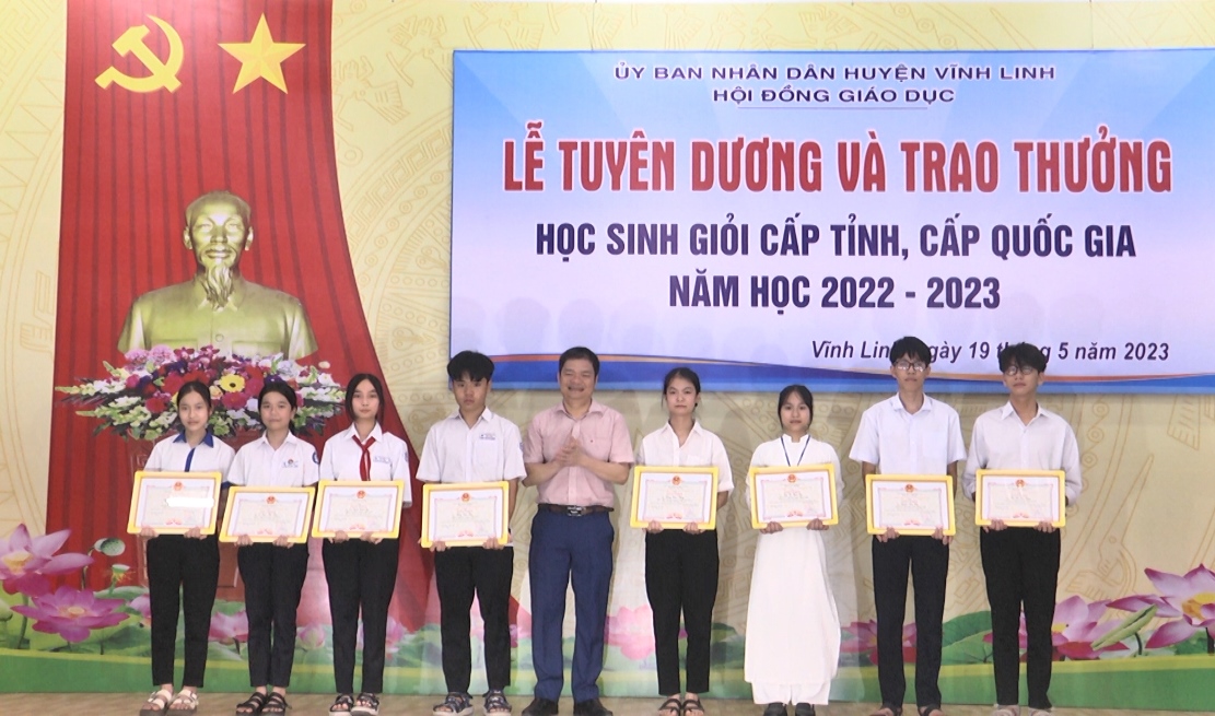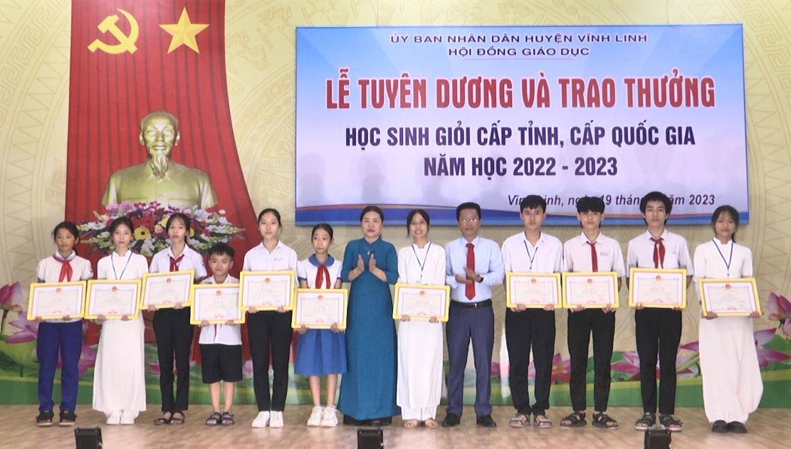 Tại buổi lễ, huyện Vĩnh Linh đã tuyên dương, trao thưởng cho các học sinh và 13 tập thể cán bộ, giáo viên đạt thành tích xuất sắc trong công tác bồi dưỡng học sinh giỏi năm học vừa qua.