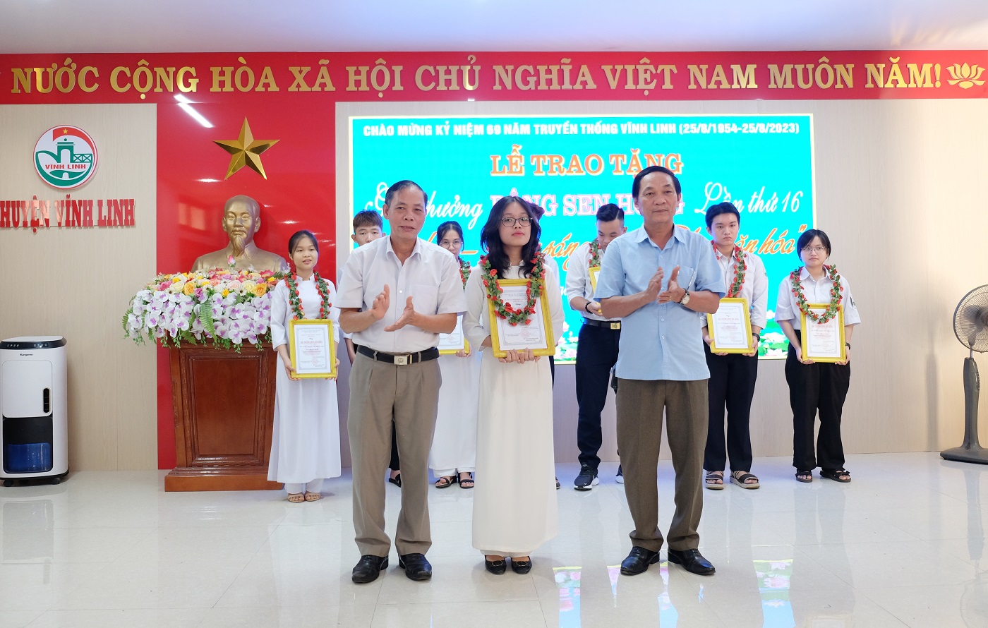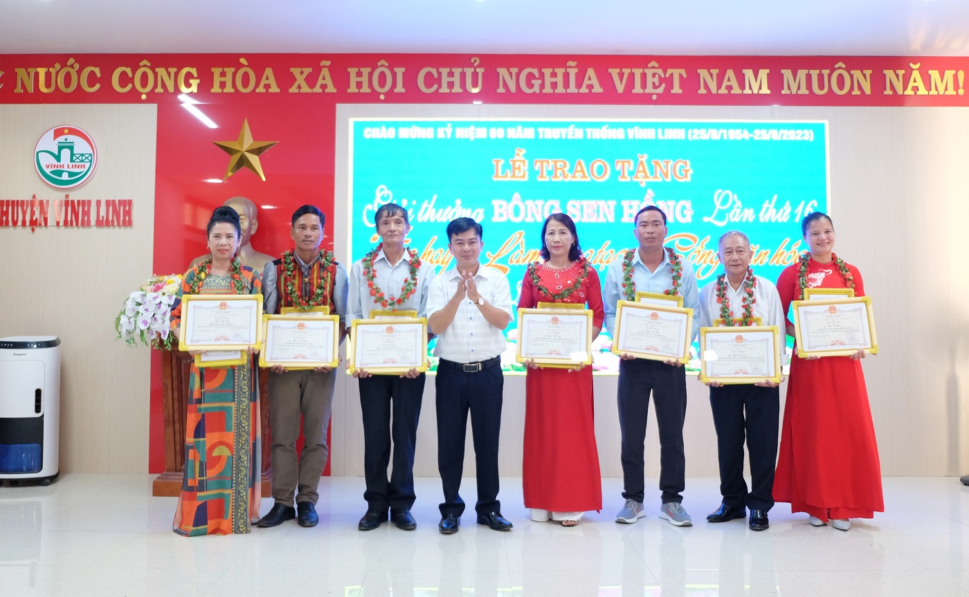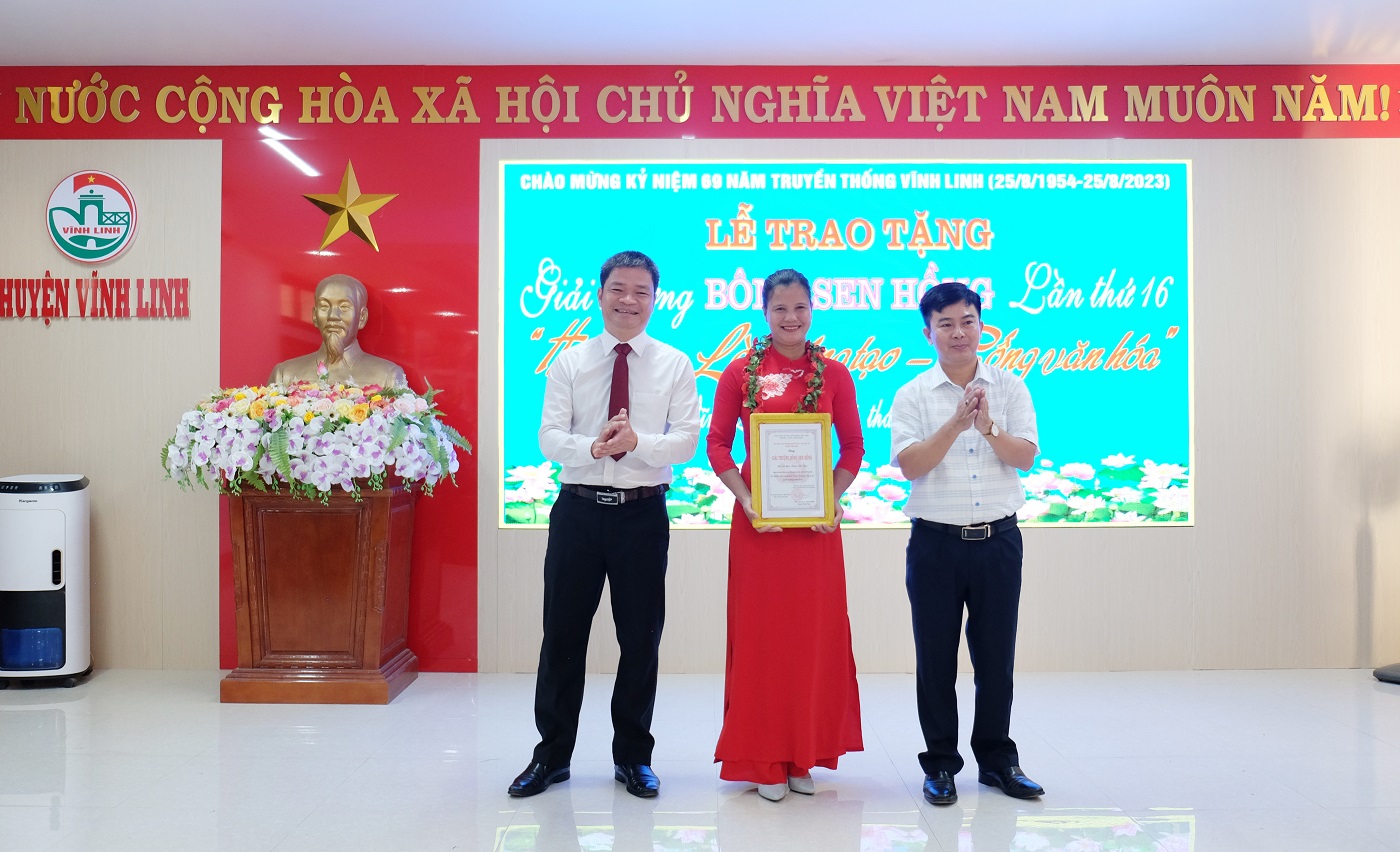 Nhân kỷ niệm 78 năm Cách mạng tháng Tám, Quốc khánh 2/9, kỷ niệm 69 năm ngày truyền thống Vĩnh Linh, ngày 25/8/2023, huyện Vĩnh Linh đã tổ chức Lễ trao giải thưởng Bông Sen Hồng lần thứ 16 cho các cá nhân có thành tích tiêu biểu trong phong trào “Học hay- Làm sáng tạo- Sống văn hóa”. Đến dự có các đồng chí: Trần Nhật Quang- Bí thư Huyện ủy, Nguyễn Thị Hương- Phó Bí thư Thường trực Huyện ủy, Chủ tịch HĐND huyện, Vũ Văn Phong- Chủ tịch UBMT huyện, Nguyễn Thiên Tùng- Phó Chủ tịch UBND huyện.