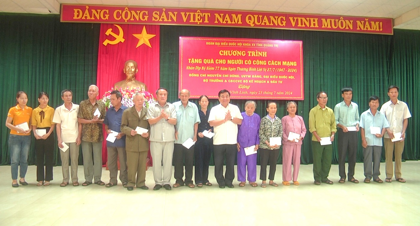 Nhân kỷ niệm 77 năm Ngày Thương binh Liệt sỹ 27/7 (1947- 2024), ngày 23/7/2024, Đoàn công tác Bộ Kế hoạch và Đầu tư, do đồng chí Nguyễn Chí Dũng - Bộ trưởng Bộ Kế hoạch và Đầu tư làm Trưởng đoàn đã có buổi thăm và tặng quà cho gia đình chính sách tại huyện Vĩnh Linh. Tham dự có các đồng chí: Hà Sỹ Đồng- Phó Chủ tịch Thường trực UBND tỉnh, Dương Tân Long- Phó Chủ tịch UBMT tỉnh. Về phía huyện có đồng chí Nguyễn Thị Hương- Phó Bí thư Thường trực Huyện ủy, Chủ tịch HĐND huyện; Thái Văn Thành- Chủ tịch UBND huyện; Phan Ngọc Khoa- Chủ tịch UBMT huyện.