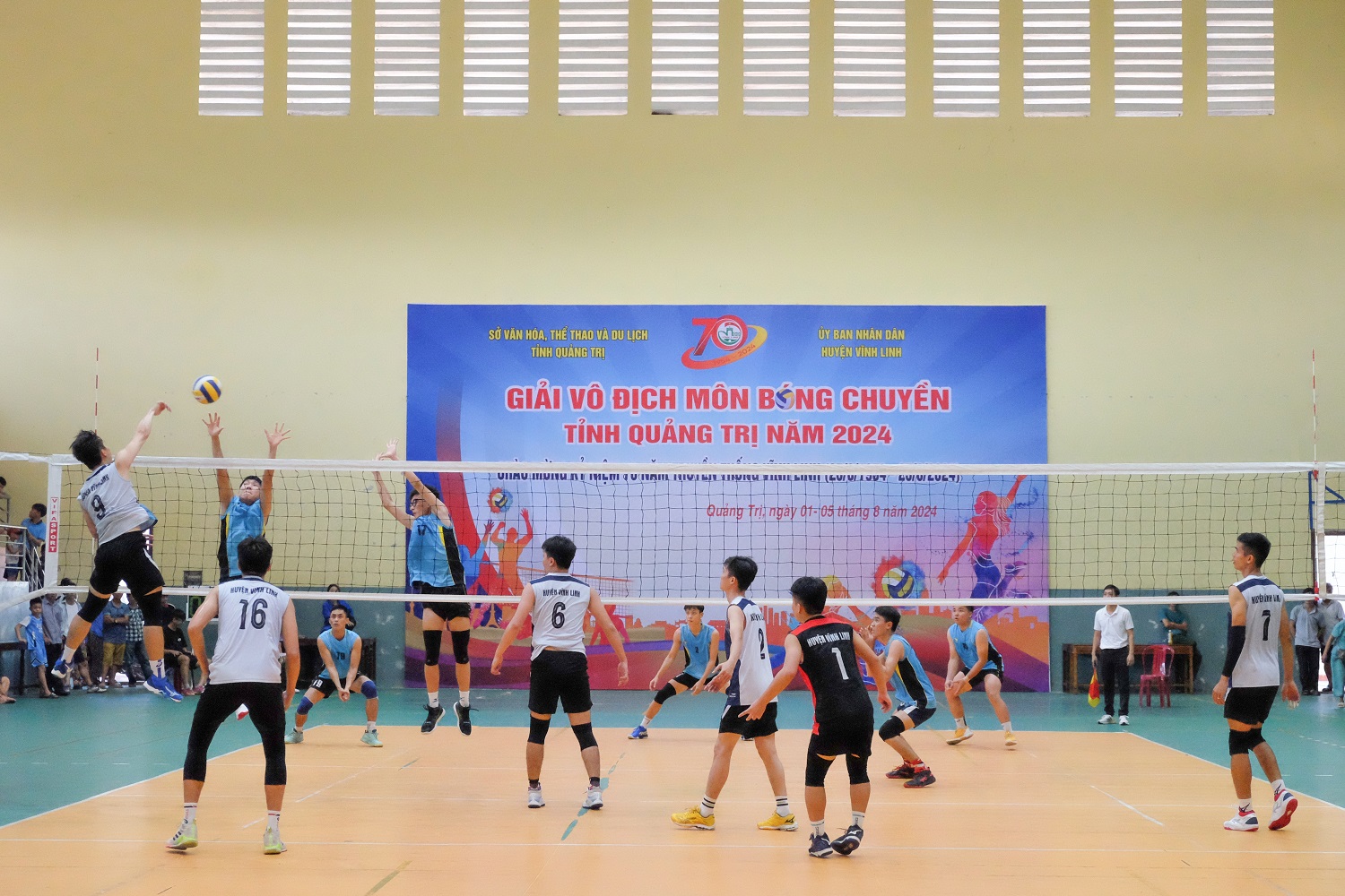 Chiều ngày 04/8, tại Nhà Thi đấu và Luyện tập TDTT huyện Vĩnh Linh tiếp tục diễn ra 2 trận đấu bán kết đầu tiên có sự góp mặt của các đội nam, nữ huyện Vĩnh Linh gặp nam TX Quảng Trị và nữ huyện Triệu Phong trong khuôn khổ Giải vô địch bóng chuyền tỉnh Quảng Trị năm 2024 chào mừng kỷ niệm 70 năm truyền thống Vĩnh Linh 25/8 (1954- 2024).