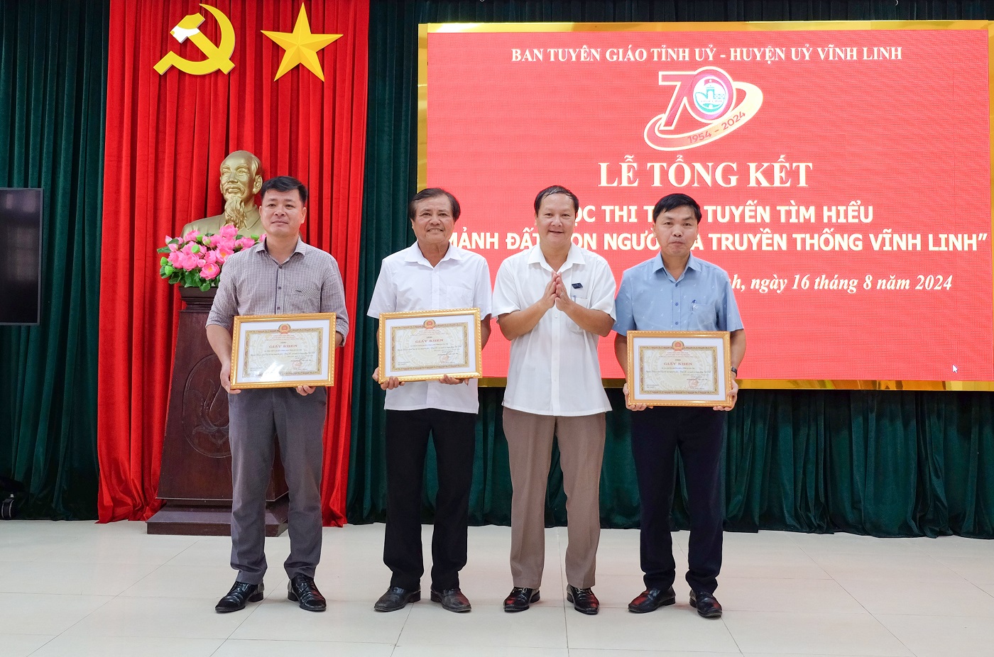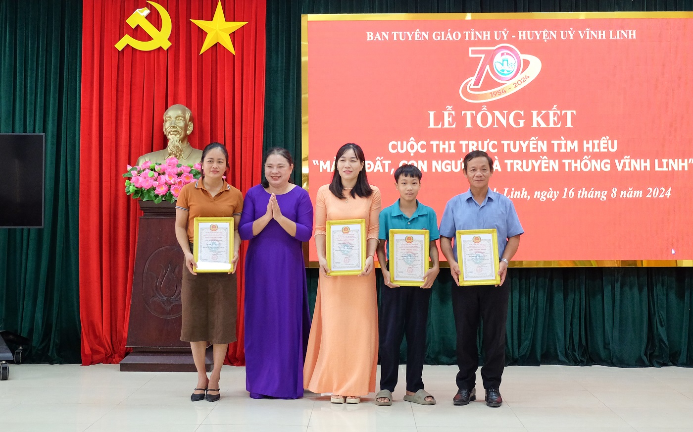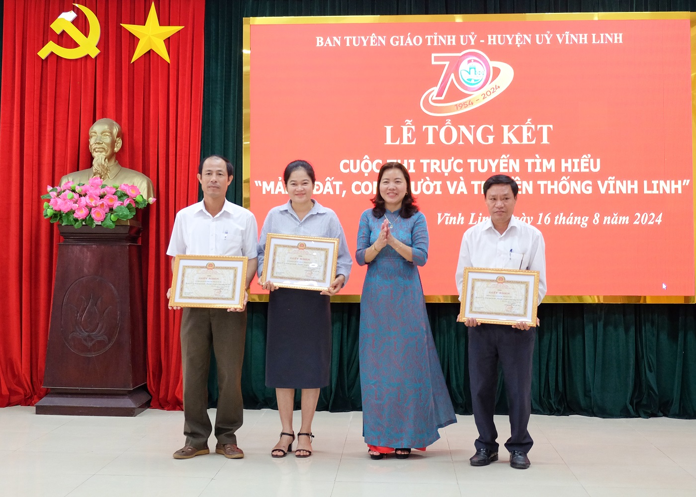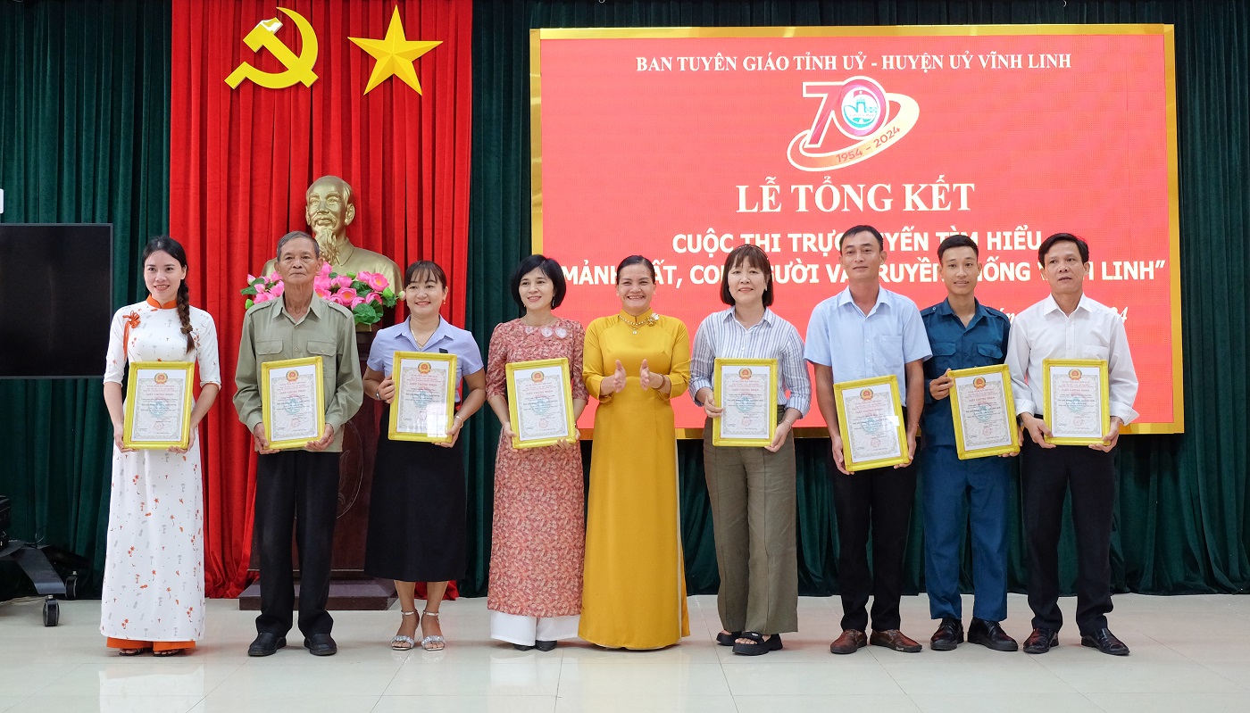 Ngày 16/8/2024, tại huyện Vĩnh Linh, Ban Tuyên giáo Tỉnh ủy và Huyện ủy Vĩnh Linh phối hợp tổ chức Lễ tổng kết Cuộc thi trực tuyến tìm hiểu “Mảnh đất, con người và truyền thống Vĩnh Linh” nhân kỷ niệm 70 năm truyền thống Vĩnh Linh 25/8 (1954- 2024). Đến dự có các đồng chí: Nguyễn Quốc Khánh - Phó Trưởng Ban Tuyên giáo Tỉnh ủy; Nguyễn Thị Huyền- Phó Giám đốc Sở Thông tin và Truyền thông. Về phía huyện Vĩnh Linh có các đồng chí: Trần Nhật Quang- Bí thư Huyện ủy; Nguyễn Thị Hương- Phó Bí thư Thường trực Huyện ủy, Chủ tịch HĐND huyện; Thái Văn Thành- Chủ tịch UBND huyện; Phan Ngọc Khoa- Chủ tịch UBMT huyện.