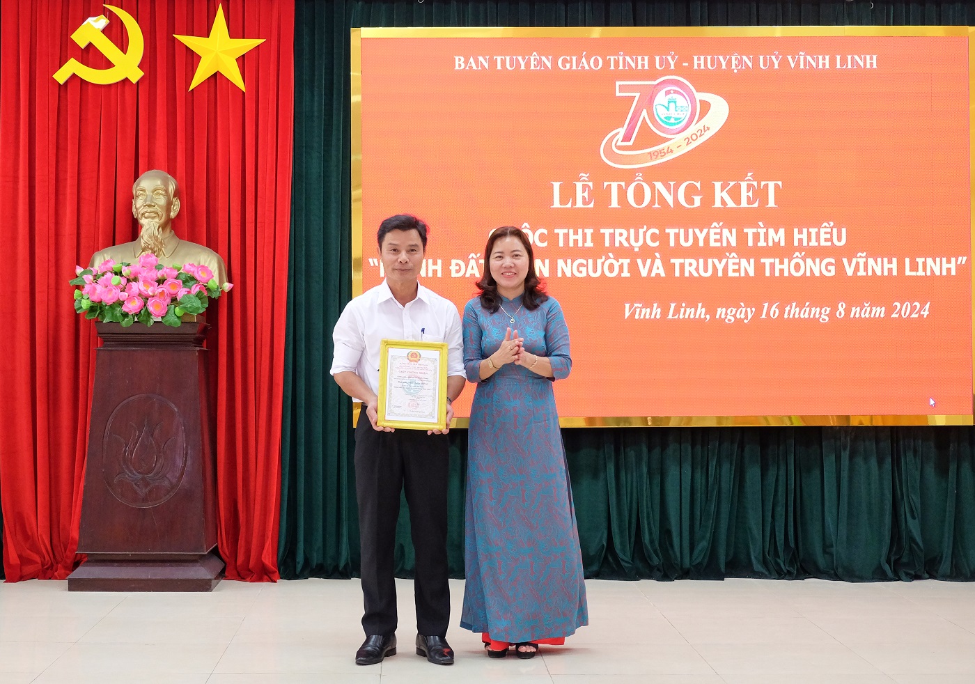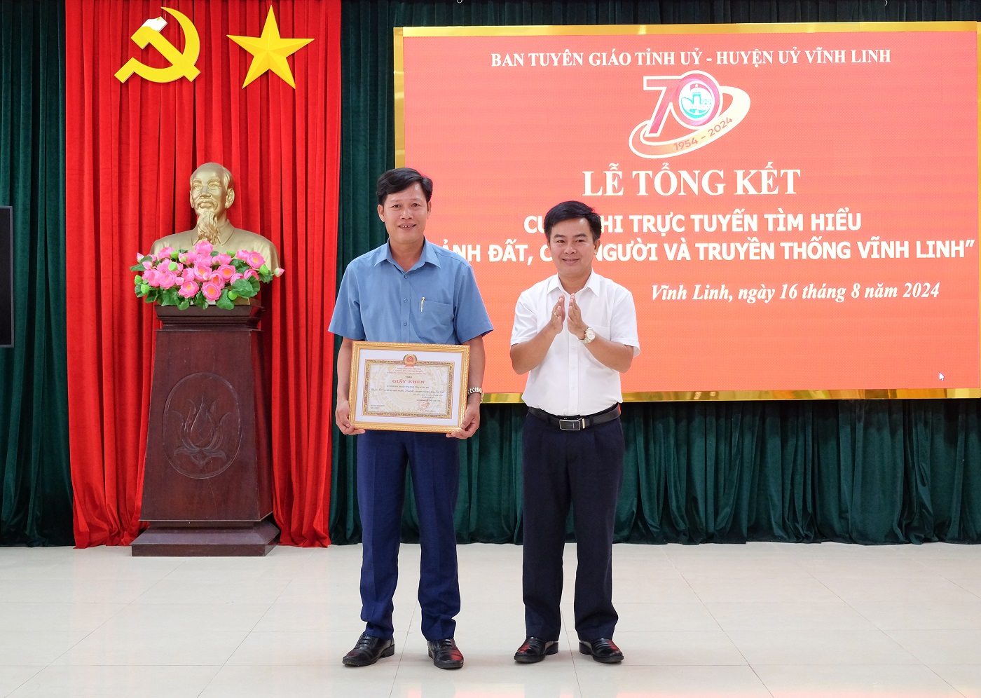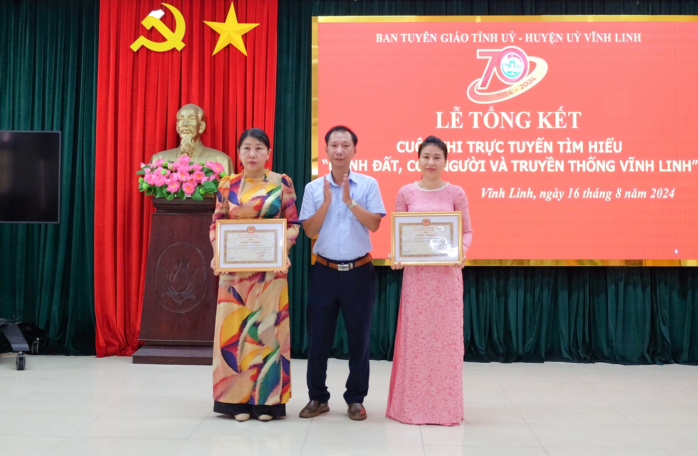 Ngày 16/8/2024, tại huyện Vĩnh Linh, Ban Tuyên giáo Tỉnh ủy và Huyện ủy Vĩnh Linh phối hợp tổ chức Lễ tổng kết Cuộc thi trực tuyến tìm hiểu “Mảnh đất, con người và truyền thống Vĩnh Linh” nhân kỷ niệm 70 năm truyền thống Vĩnh Linh 25/8 (1954- 2024). Đến dự có các đồng chí: Nguyễn Quốc Khánh - Phó Trưởng Ban Tuyên giáo Tỉnh ủy; Nguyễn Thị Huyền- Phó Giám đốc Sở Thông tin và Truyền thông. Về phía huyện Vĩnh Linh có các đồng chí: Trần Nhật Quang- Bí thư Huyện ủy; Nguyễn Thị Hương- Phó Bí thư Thường trực Huyện ủy, Chủ tịch HĐND huyện; Thái Văn Thành- Chủ tịch UBND huyện; Phan Ngọc Khoa- Chủ tịch UBMT huyện.