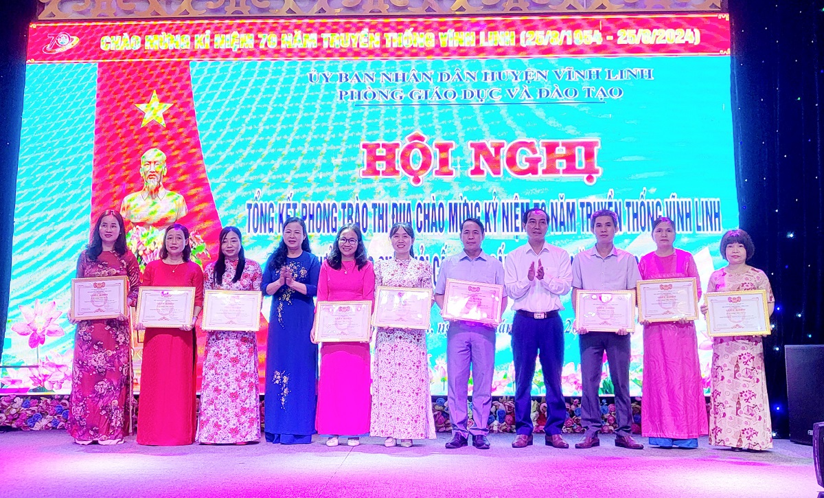 Ngày 16/8/2024, Phòng GD&ĐT Vĩnh Linh tổ chức hội nghị tổng kết phong trào thi đua chào mừng 70 năm truyền thống Vĩnh Linh 25/8 (1954 - 2024) và tuyên dương, khen thưởng học sinh giỏi cấp tỉnh, cấp quốc gia năm học 2023 - 2024. Tham dự có các đồng chí: Võ Văn Minh - Phó Giám đốc Sở GD&ĐT tỉnh Quảng Trị; Nguyễn Thị Hương - Phó Bí thư Thường trực Huyện ủy, Chủ tịch HĐND huyện; Nguyễn Thiên Tùng - Phó Chủ tịch UBND huyện Vĩnh Linh.