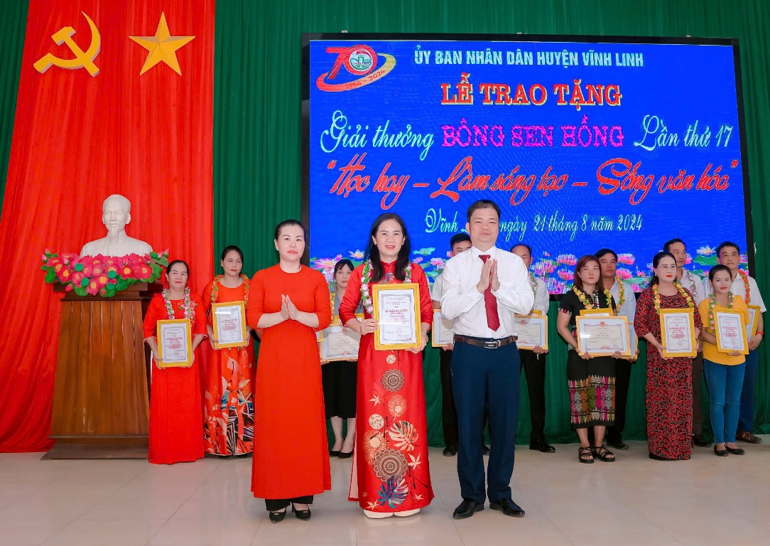 Nhân kỷ niệm 79 năm ngày Cách mạng Tháng 8 và Quốc khánh 2/9, 70 năm ngày truyền thống 25/8 (1954 - 2024), ngày 21/8/2024, huyện Vĩnh Linh đã tổ chức Lễ trao tặng giải thưởng Bông Sen Hồng lần thứ 17 nhằm ghi nhận những đóng góp tích cực của các cá nhân xuất sắc trong phong trào “Học hay- Làm sáng tạo- Sống văn hóa” trên địa bàn.
