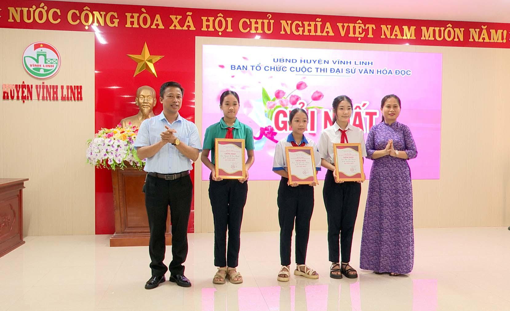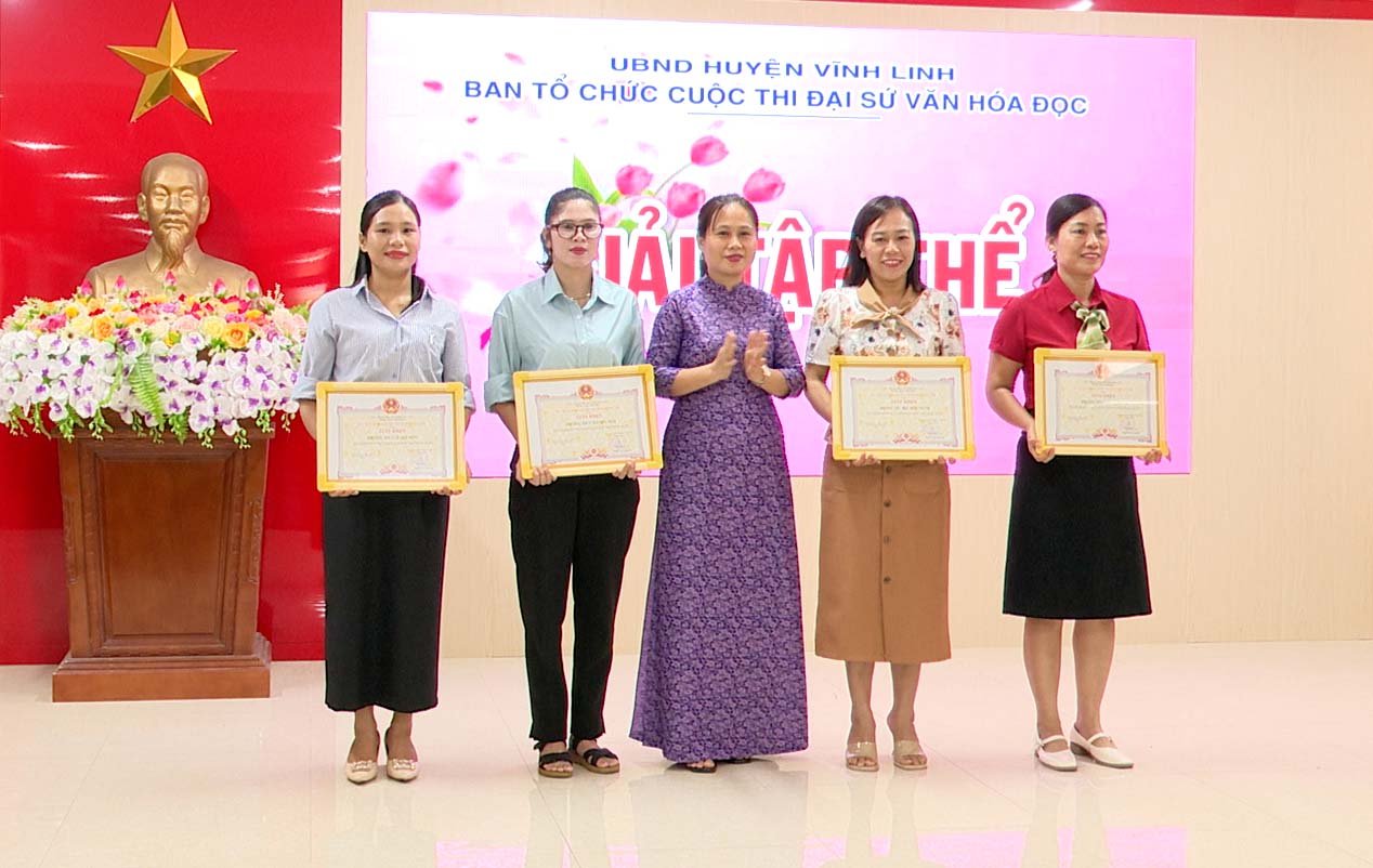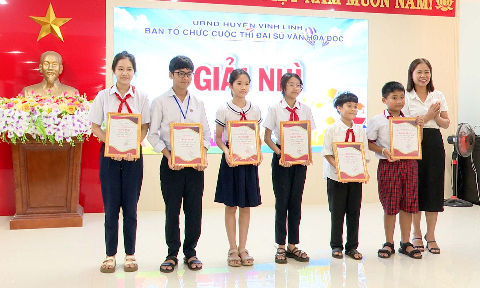 Cuộc thi Đại sứ Văn hóa đọc huyện Vĩnh Linh năm nay thu hút 199 học sinh từ cấp tiểu học đến trung học phổ thông tham dự. Theo đánh giá, nhiều bài thi ý tưởng mới, hình thức đa dạng, cách thể hiện độc đáo. Kết quả, Ban Tổ chức đã xét chọn 4 tập thể và 51 gương mặt Đại sứ Văn hóa đọc tiêu biểu.